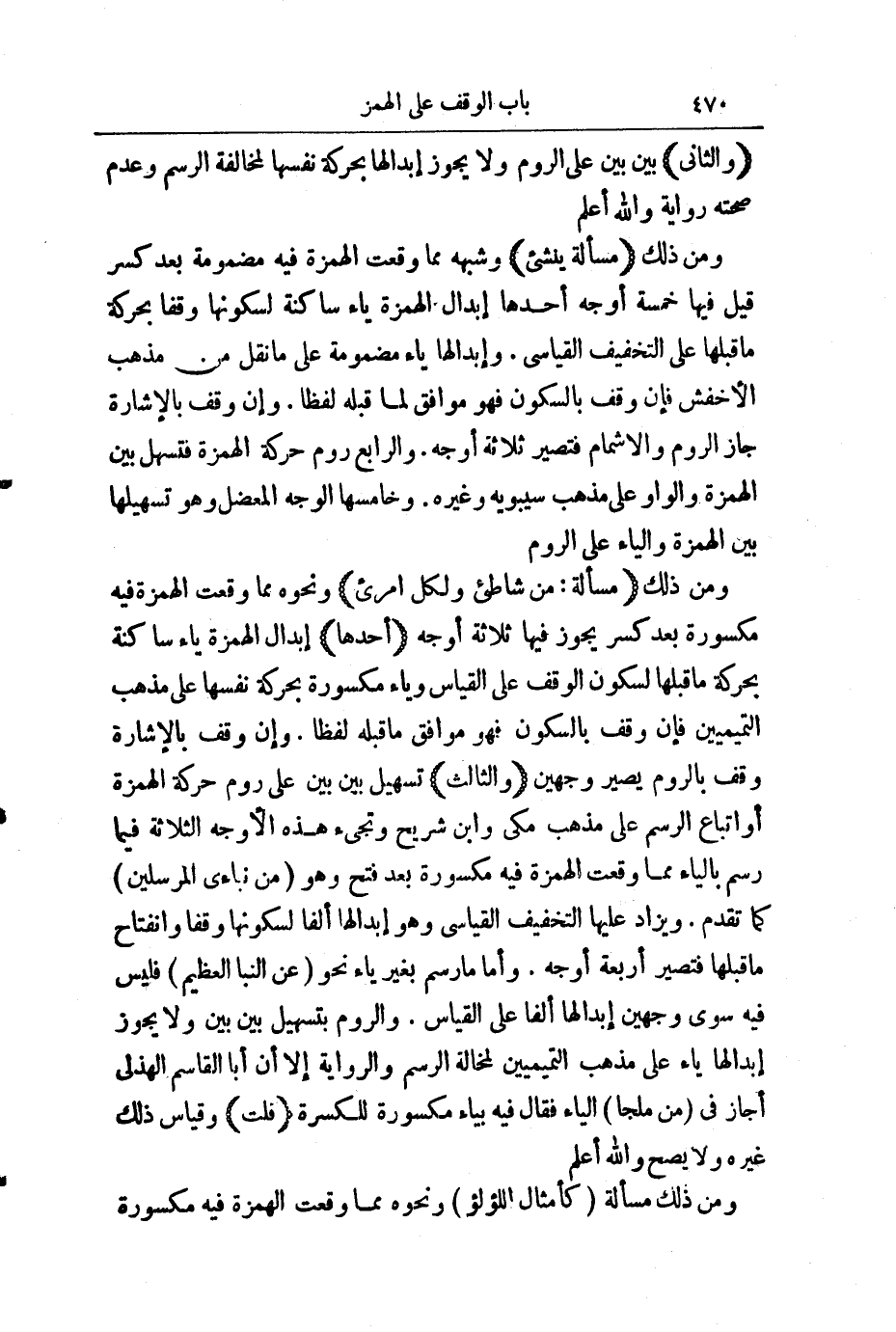 وَمِنْ ذَلِكَ (مَسْأَلَةُ: يُنْشِئُ) ، وَشِبْهُهُ مِمَّا وَقَعَتِ الْهَمْزَةُ فِيهِ مَضْمُومَةً بَعْدَ كَسْرٍ، قِيلَ: فِيهَا خَمْسَةُ أَوْجُهٍ، أَحَدُهَا إِبْدَالُ الْهَمْزَةِ يَاءً سَاكِنَةً؛ لِسُكُونِهَا وَقْفًا بِحَرَكَةِ مَا قَبْلَهَا عَلَى التَّخْفِيفِ الْقِيَاسِيِّ، وَإِبْدَالُهَا يَاءً مَضْمُومَةً عَلَى مَا نُقِلَ مِنْ مَذْهَبِ الْأَخْفَشِ، فَإِنْ وَقَفَ بِالسُّكُونِ فَهُوَ مُوَافِقٌ لِمَا قَبْلَهُ لَفْظًا. وَإِنْ وَقَفَ بِالْإِشَارَةِ جَازَ الرَّوْمُ وَالْإِشْمَامُ فَتَصِيرُ ثَلَاثَةَ أَوْجَهٍ، وَالرَّابِعُ: رَوْمُ حَرَكَةِ الْهَمْزَةِ فَتُسَهَّلُ بَيْنَ الْهَمْزَةِ وَالْوَاوِ عَلَى مَذْهَبِ سِيبَوَيْهِ وَغَيْرِهِ، وَخَامِسُهَا: الْوَجْهُ الْمُعْضِلُ، وَهُوَ تَسْهِيلُهَا بَيْنَ الْهَمْزَةِ وَالْيَاءِ عَلَى الرَّوْمِ.