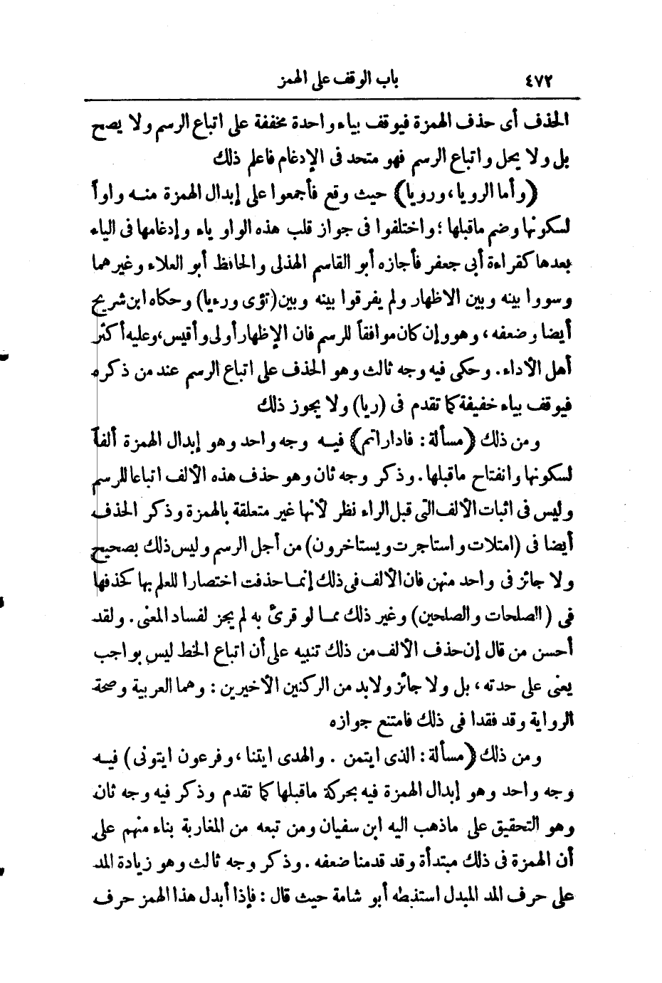 وَمِنْ ذَلِكَ (مَسْأَلَةُ: فَادَّارَاتُمْ) فِيهِ وَجْهٌ وَاحِدٌ، وَهُوَ إِبْدَالُ الْهَمْزَةِ أَلِفًا لِسُكُونِهَا وَانْفِتَاحِ مَا قَبْلَهَا، وَذُكِرَ وَجْهٌ ثَانٍ، وَهُوَ حَذْفُ الْأَلِفِ اتِّبَاعًا لِلرَّسْمِ، وَلَيْسَ فِي إِثْبَاتِ الْأَلِفِ الَّتِي قَبْلَ الرَّاءِ نَظَرٌ؛ لِأَنَّهَا غَيْرُ مُتَعَلِّقَةِ بِالْهَمْزَةِ، وَذَكَرَ الْحَذْفَ أَيْضًا فِي (امْتَلَاتِ وَاسْتَاجَرْتَ وَيَسْتَاخِرُونَ) مِنْ أَجْلِ الرَّسْمِ وَلَيْسَ ذَلِكَ بِصَحِيحٍ وَلَا جَائِزٍ فِي وَاحِدٍ مِنْهُنَّ، فَإِنَّ الْأَلِفَ فِي ذَلِكَ إِنَّمَا حُذِفَتِ اخْتِصَارًا لِلْعِلْمِ بِهَا كَحَذْفِهَا فِي (الصَّالِحَاتِ، وَالصَّالِحِينَ) وَغَيْرِ ذَلِكَ مِمَّا لَوْ قُرِئَ بِهِ لَمْ يَجُزْ لِفَسَادِ الْمَعْنَى، وَلَقَدْ أَحْسَنَ مَنْ قَالَ: إِنَّ حَذْفَ الْأَلِفِ مِنْ ذَلِكَ تَنْبِيهٌ عَلَى أَنَّ اتِّبَاعَ الْخَطِّ لَيْسَ بِوَاجِبٍ - يَعْنِي عَلَى حِدَتِهِ - بَلْ وَلَا جَائِزٍ، وَلَا بُدَّ مِنَ الرُّكْنَيْنِ الْأَخِيرَيْنِ: وَهُمَا الْعَرَبِيَّةُ وَصِحَّةُ الرِّوَايَةِ، وَقَدْ فُقِدَا فِي ذَلِكَ فَامْتَنَعَ جَوَازُهُ.