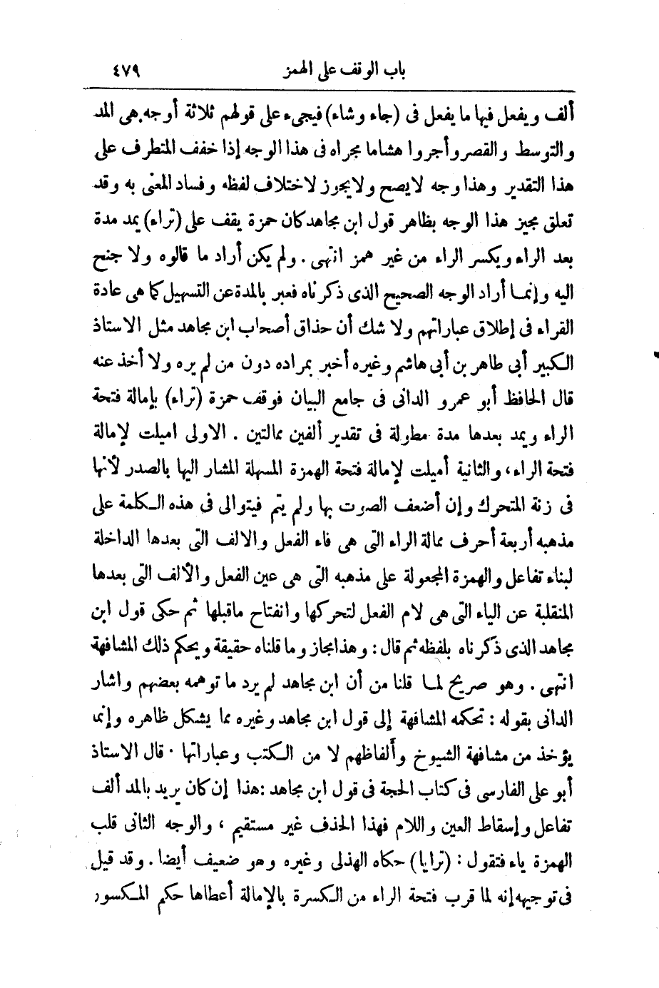 أَلِفٍ، وَيُفْعَلُ فِيهَا مَا يُفْعَلُ فِي (جَاءَ، وَشَاءَ) فَيَجِيءُ عَلَى قَوْلِهِمْ: ثَلَاثَةُ أَوْجُهٍ هِيَ الْمَدُّ وَالتَّوَسُّطُ وَالْقَصْرُ، وَأَجْرَوْا هِشَامًا مَجْرَاهُ فِي هَذَا الْوَجْهِ إِذَا خَفَّفَ الْمُتَطَرِّفَ عَلَى هَذَا التَّقْدِيرِ، وَهَذَا وَجْهٌ لَا يَصِحُّ وَلَا يَجُوزُ لِاخْتِلَافِ لَفْظِهِ وَفَسَادِ الْمَعْنَى بِهِ، وَقَدْ تَعَلَّقَ مُجِيزُ هَذَا الْوَجْهِ بِظَاهِرِ قَوْلِ ابْنِ مُجَاهِدٍ: كَانَ حَمْزَةُ يَقِفُ عَلَى (تَرَاءَ) يَمُدُّ مَدَّةً بَعْدَ الرَّاءِ وَيَكْسِرُ الرَّاءَ مِنْ غَيْرِ هَمْزٍ. انْتَهَى. وَلَمْ يَكُنْ أَرَادَ مَا قَالُوهُ وَلَا جَنَحَ إِلَيْهِ، وَإِنَّمَا أَرَادَ الْوَجْهَ الصَّحِيحَ الَّذِي ذَكَرْنَاهُ، فَعَبَّرَ بِالْمَدَّةِ عَنِ التَّسْهِيلِ كَمَا هِيَ عَادَةُ الْقُرَّاءِ فِي إِطْلَاقِ عِبَارَاتِهِمْ، وَلَا شَكَّ أَنَّ حُذَّاقَ أَصْحَابِ ابْنِ مُجَاهِدٍ مِثْلَ الْأُسْتَاذِ الْكَبِيرِ أَبِي طَاهِرِ بْنِ أَبِي هِشَامٍ وَغَيْرِهِ أَخْبَرَ بِمُرَادِهِ دُونَ مَنْ لَمْ يَرَهُ وَلَا أَخْذَ عَنْهُ، قَالَ الْحَافِظُ أَبُو الْعَلَاءِ الدَّانِيُّ فِي " جَامِعِ الْبَيَانِ ": فَوَقَفَ حَمْزَةُ (تَرَاءَ) بِإِمَالَةِ فَتْحَةِ الرَّاءِ وَيَمُدُّ بَعْدَهَا مَدَّةً مُطَوَّلَةً فِي تَقْدِيرِ أَلِفَيْنِ مُمَالَتَيْنِ. الْأُولَى أُمِيلَتْ لِإِمَالَةِ فَتْحَةِ الرَّاءِ، وَالثَّانِيَةُ أُمِيلَتْ لِإِمَالَةِ فَتْحَةِ الْهَمْزَةِ الْمُسَهَّلَةِ الْمُشَارِ إِلَيْهَا بِالصَّدْرِ؛ لِأَنَّهَا فِي زِنَةِ الْمُتَحَرِّكِ، وَإِنْ أُضْعِفَ الصَّوْتُ بِهَا وَلَمْ يَتِمَّ فَيَتَوَالَى فِي هَذِهِ الْكَلِمَةِ عَلَى مَذْهَبِهِ أَرْبَعَةُ أَحْرُفٍ مُمَالَةٍ: الرَّاءُ الَّتِي هِيَ فَاءُ الْفِعْلِ، وَالْأَلِفُ الَّتِي بَعْدَهَا الدَّاخِلَةُ لِبِنَاءِ " تَفَاعَلَ "، وَالْهَمْزَةُ الْمَجْعُولَةُ عَلَى مَذْهَبِهِ الَّتِي هِيَ عَيْنُ الْفِعْلِ، وَالْأَلِفُ الَّتِي بَعْدَهَا الْمُنْقَلِبَةُ عَنِ الْيَاءِ الَّتِي هِيَ لَامُ الْفِعْلِ لِتَحَرُّكِهَا وَانْفِتَاحِ مَا قَبْلَهَا، ثُمَّ حَكَى قَوْلَ ابْنِ مُجَاهِدٍ الَّذِي ذَكَرْنَاهُ بِلَفْظَهِ، ثُمَّ قَالَ: وَهَذَا مَجَازٌ، وَمَا قُلْنَاهُ حَقِيقَةٌ، وَيَحْكُمُ ذَلِكَ الْمُشَافَهَةُ. انْتَهَى. وَهُوَ صَرِيحٌ لِمَا قُلْنَاهُ مِنْ أَنَّ ابْنَ مُجَاهِدٍ لَمْ يُرِدْ مَا تَوَهَّمَهُ بَعْضُهُمْ، وَأَشَارَ الدَّانِيُّ بِقَوْلِهِ: تَحْكُمُهُ الْمُشَافَهَةُ إِلَى قَوْلِ ابْنِ مُجَاهِدٍ وَغَيْرِهِ مِمَّا يُشَكِّلُ ظَاهِرَةً، وَإِنَّمَا يُؤْخَذُ مِنْ مُشَافَهَةِ الشُّيُوخِ وَأَلْفَاظِهِمْ لَا مِنَ الْكُتُبِ وَعِبَارَاتِهَا. قَالَ الْأُسْتَاذُ أَبُو عَلِيٍّ الْفَارِسِيُّ فِي كِتَابِ الْحُجَّةِ فِي قَوْلِ ابْنِ مُجَاهِدٍ: هَذَا إِنْ كَانَ يُرِيدُ بِالْمَدِّ أَلِفَ " تَفَاعَلَ " وَإِسْقَاطَ الْعَيْنِ وَاللَّامِ، فَهَذَا الْحَذْفُ غَيْرُ مُسْتَقِيمٍ، وَالْوَجْهُ الثَّانِي قَلْبُ الْهَمْزَةِ يَاءً، فَتَقُولُ: (تَرَايَا) حَكَاهُ الْهُذَلِيُّ وَغَيْرُهُ، وَهُوَ ضَعِيفٌ أَيْضًا. وَقَدْ قِيلَ فِي تَوْجِيهِهِ: إِنَّهُ لَمَّا قَرَّبَ فَتْحَةَ الرَّاءِ مِنَ الْكَسْرَةِ بِالْإِمَالَةِ أَعْطَاهَا حُكْمَ الْمَكْسُورِ،