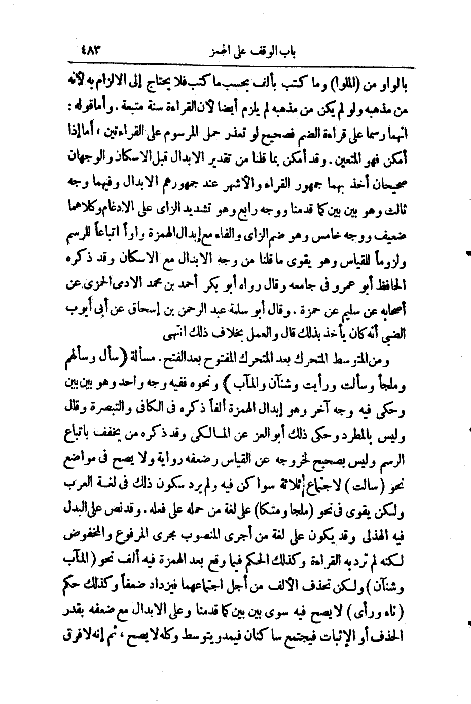 بِالْوَاوِ مِنْ (الْمَلَوُا) وَمَا كُتِبَ بِأَلِفٍ بِحَسَبِ مَا كُتِبَ فَلَا يَحْتَاجُ إِلَى الْإِلْزَامِ بِهِ ; لِأَنَّهُ مِنْ مَذْهَبِهِ، وَلَوْ لَمْ يَكُنْ مِنْ مَذْهَبِهِ لَمْ يَلْزَمْ ; لِأَنَّ الْقِرَاءَةَ سُنَّةٌ مُتَّبَعَةٌ، وَأَمَّا قَوْلُهُ: إِنَّهُمَا رُسِمَا عَلَى قِرَاءَةِ الضَّمِّ فَصَحِيحٌ لَوْ تَعَذَّرَ حَمْلُ الْمَرْسُومِ عَلَى الْقِرَاءَتَيْنِ، أَمَّا إِذَا أَمْكَنَ فَهُوَ الْمُتَعَيَّنُ. وَقَدْ أَمْكَنَ بِمَا قُلْنَا مِنْ تَقْدِيرِ الْإِبْدَالِ قَبْلَ الْإِسْكَانِ، وَالْوَجْهَانِ صَحِيحَانِ أَخَذَ بِهِمَا جُمْهُورُ الْقُرَّاءِ، وَالْأَشْهَرُ عِنْدَ جُمْهُورِهِمُ الْإِبْدَالُ، وَفِيهِمَا وَجْهٌ ثَالِثٌ، وَهُوَ بَيْنَ بَيْنَ كَمَا قَدَّمْنَا وَوَجْهٌ رَابِعٌ وَهُوَ تَشْدِيدُ الزَّايِ عَلَى الْإِدْغَامِ، وَكِلَاهُمَا ضَعِيفٌ، وَوَجْهٌ خَامِسٌ وَهُوَ ضَمُّ الزَّايِ وَالْفَاءِ مَعَ إِبْدَالِ الْهَمْزَةِ وَاوًا اتِّبَاعًا لِلرَّسْمِ وَلُزُومًا لِلْقِيَاسِ، وَهُوَ يُقَوِّي مَا قُلْنَاهُ مِنْ وَجْهِ الْإِبْدَالِ مَعَ الْإِسْكَانِ، وَقَدْ ذَكَرَهُ الْحَافِظُ أَبُو عَمْرٍو فِي جَامِعِهِ، وَقَالَ: رَوَاهُ أَبُو بَكْرٍ أَحْمَدُ بْنُ مُحَمَّدٍ الْآدَمِيُّ الْحَمْزِيُّ، عَنْ أَصْحَابِهِ، عَنْ سُلَيْمٍ، عَنْ حَمْزَةَ. وَقَالَ أَبُو سَلَمَةَ عَبْدُ الرَّحْمَنِ بْنُ إِسْحَاقَ، عَنْ أَبِي أَيُّوبَ الضَّبِّيِّ أَنَّهُ كَانَ يَأْخُذُ بِذَلِكَ، قَالَ: وَالْعَمَلُ بِخِلَافِ ذَلِكَ. انْتَهَى.