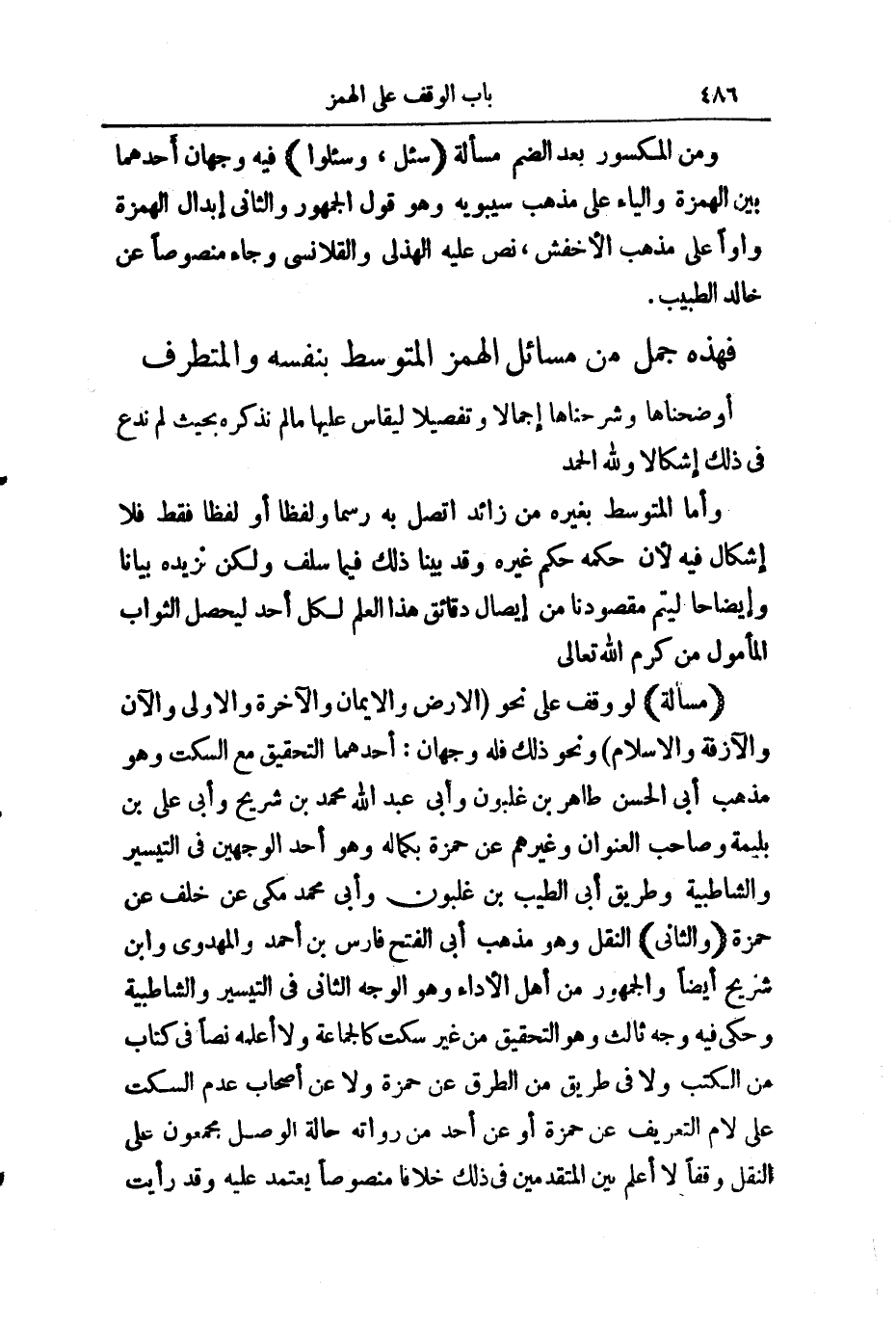(مَسْأَلَةٌ) لَوْ وُقِفَ عَلَى نَحْوِ (الَارْضُ، وَالِايْمَانَ، وَالْآخِرَةَ وَالُاولَى، وَالْآنَ، وَالْآزِفَةُ، وَالِاسْلَامُ) وَنَحْوِ ذَلِكَ فَلَهُ وَجْهَانِ: أَحَدُهُمَا التَّحْقِيقُ مَعَ السَّكْتِ، وَهُوَ مَذْهَبُ أَبِي الْحَسَنِ طَاهِرِ بْنِ غَلْبُونَ، وَأَبِي عَبْدِ اللَّهِ مُحَمَّدِ بْنِ شُرَيْحٍ وَأَبِي عَلِيِّ بْنِ بَلِّيمَةَ صَاحِبِ " الْعُنْوَانِ "، وَغَيْرُهُمْ، عَنْ حَمْزَةَ بِكَمَالِهِ، وَهُوَ أَحَدُ الْوَجْهَيْنِ فِي " التَّيْسِيرِ " وَ " الشَّاطِبِيَّةِ "، وَطَرِيقُ أَبِي الطَّيِّبِ بْنِ غَلْبُونَ وَأَبِي مُحَمَّدٍ مَكِّيٍّ، عَنْ خَلَفٍ، عَنْ حَمْزَةَ.