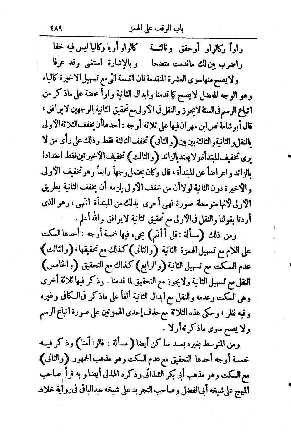 وَمِنْ ذَلِكَ (مَسْأَلَةُ: قُلْ أَأَنْتُمْ يَجِيءُ فِيهَا خَمْسَةُ أَوْجُهٍ) : أَحَدُهَا السَّكْتُ عَلَى اللَّامِ مَعَ تَسْهِيلِ الْهَمْزَةِ الثَّانِيَةِ (وَالثَّانِي) كَذَلِكَ مَعَ تَحْقِيقِهَا (وَالثَّالِثُ) عَدَمُ السَّكْتِ مَعَ تَسْهِيلِ الثَّانِيَةِ، وَلَا يَجُوزُ مَعَ التَّحْقِيقِ لِمَا قَدَّمَنَا، وَذَكَرَ فِيهَا ثَلَاثَةً أُخْرَى وَهِيَ السَّكْتُ وَعَدَمُهُ، وَالنَّقْلُ مَعَ إِبْدَالِ الثَّانِيَةِ أَلِفًا عَلَى مَا ذُكِرَ فِي " الْكَافِي " وَغَيْرِهِ، وَفِيهِ نَظَرٌ، وَحَكَى هَذِهِ الثَّلَاثَةَ مَعَ حَذْفِ إِحْدَى الْهَمْزَتَيْنِ عَلَى صُورَةِ اتِّبَاعِ الرَّسْمِ وَلَا يَصِحُّ سِوَى مَا ذَكَرْتُهُ أَوَّلًا.