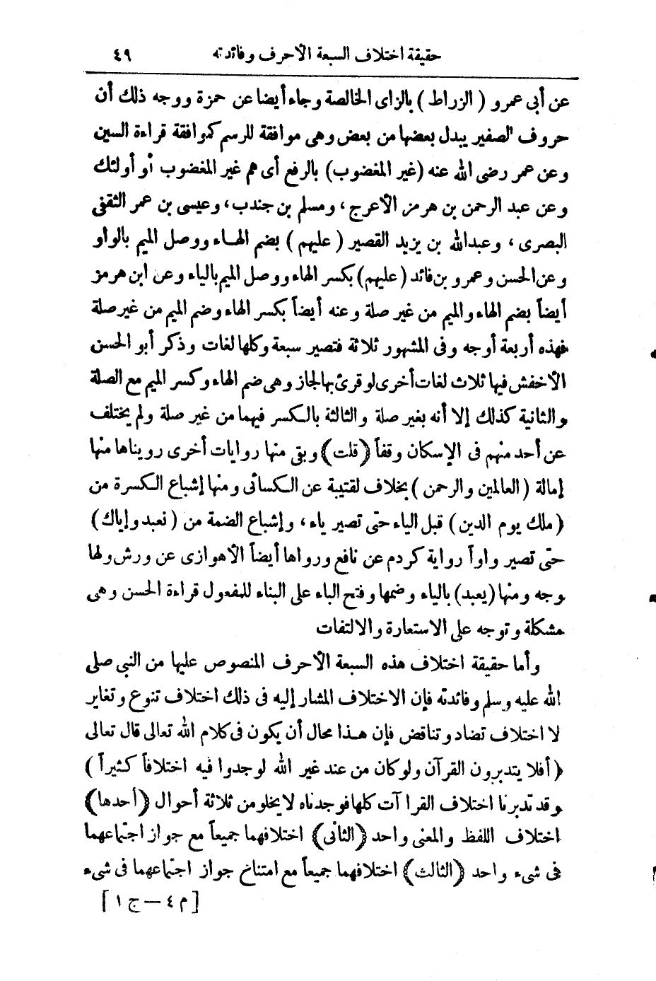 وَأَمَّا حَقِيقَةُ اخْتِلَافِ هَذِهِ السَّبْعَةِ الْأَحْرُفِ الْمَنْصُوصِ عَلَيْهَا مِنَ النَّبِيِّ - صَلَّى اللَّهُ عَلَيْهِ وَسَلَّمَ - وَفَائِدَتُهُ، فَإِنَّ الِاخْتِلَافَ الْمُشَارَ إِلَيْهِ فِي ذَلِكَ اخْتِلَافُ تَنَوُّعٍ وَتَغَايُرٍ لَا اخْتِلَافَ تَضَادٍّ وَتَنَاقُضٍ، فَإِنَّ هَذَا مُحَالٌ أَنْ يَكُونَ فِي كَلَامِ اللَّهِ تَعَالَى قَالَ - تَعَالَى -: أَفَلَا يَتَدَبَّرُونَ الْقُرْآنَ وَلَوْ كَانَ مِنْ عِنْدِ غَيْرِ اللَّهِ لَوَجَدُوا فِيهِ اخْتِلَافًا كَثِيرًا، وَقَدْ تَدَبَّرْنَا اخْتِلَافَ الْقِرَاءَاتِ كُلِّهَا فَوَجَدْنَاهَا لَا تَخْلُو مِنْ ثَلَاثَةِ أَحْوَالٍ: (أَحَدُهَا) اخْتِلَافُ اللَّفْظِ وَالْمَعْنَى وَاحِدٌ، (الثَّانِي) اخْتِلَافُهُمَا جَمِيعًا مَعَ جَوَازِ اجْتِمَاعِهِمَا فِي شَيْءٍ وَاحِدٍ، (الثَّالِثُ) اخْتِلَافُهُمَا جَمِيعًا مَعَ امْتِنَاعِ جَوَازِ اجْتِمَاعِهِمَا فِي شَيْءٍ