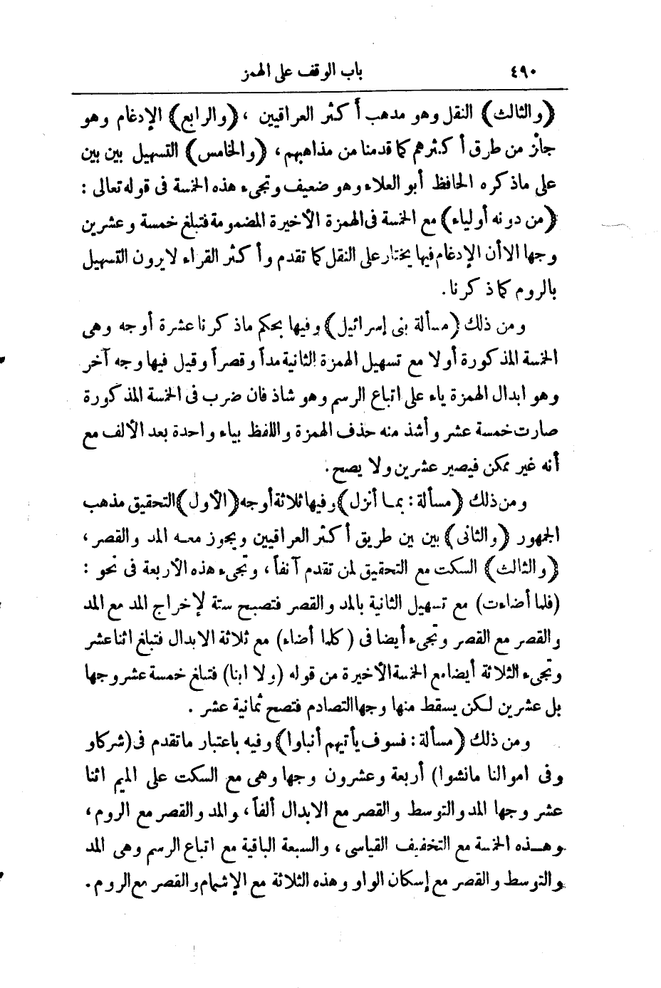 (وَالثَّالِثُ) النَّقْلُ، وَهُوَ مَذْهَبُ أَكْثَرِ الْعِرَاقِيِّينَ (وَالرَّابِعُ) الْإِدْغَامُ، وَهُوَ جَائِزٌ مِنْ طُرُقِ أَكْثَرِهِمْ كَمَا قَدَّمْنَا مِنْ مَذَاهِبِهِمْ (وَالْخَامِسُ) التَّسْهِيلُ بَيْنَ بَيْنَ عَلَى مَا ذَكَرَهُ الْحَافِظُ أَبُو الْعَلَاءِ، وَهُوَ ضَعِيفٌ وَتَجِيءُ هَذِهِ الْخَمْسَةُ فِي قَوْلِهِ تَعَالَى: (مِنْ دُونِهِ أَوْلِيَاءَ) مَعَ الْخَمْسَةِ فِي الْهَمْزَةِ الْأَخِيرَةِ الْمَضْمُومَةِ فَتَبْلُغُ خَمْسَةً وَعِشْرِينَ وَجْهًا، إِلَّا أَنَّ الْإِدْغَامَ فِيهَا يُخْتَارُ عَلَى النَّقْلِ كَمَا تَقَدَّمَ، وَأَكْثَرُ الْقُرَّاءِ لَا يَرَوْنَ التَّسْهِيلَ بِالرَّوْمِ كَمَا ذَكَرْنَا.