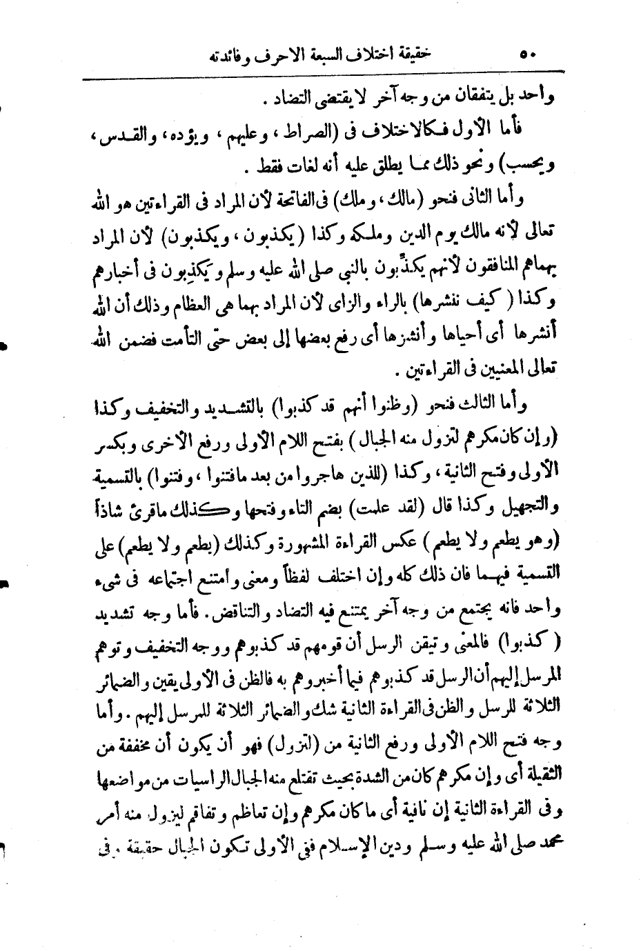 وَأَمَّا الثَّالِثُ فَنَحْوَ (وَظَنُّوا أَنَّهُمْ قَدْ كُذِبُوا) بِالتَّشْدِيدِ وَالتَّخْفِيفِ، وَكَذَا (وَإِنْ كَانَ مَكْرُهُمْ لِتَزُولَ مِنْهُ الْجِبَالُ) بِفَتْحِ اللَّامِ وَرَفْعِ الْأُخْرَى وَبِكَسْرِ الْأُولَى وَفَتْحِ الثَّانِيَةِ، وَكَذَا (لِلَّذِينَ هَاجَرُوا مِنْ بَعْدِ مَا فُتِنُوا، وَفَتَنُوا) بِالتَّسْمِيَةِ وَالتَّجْهِيلِ، وَكَذَا قَالَ: (لَقَدْ عَلِمْتَ) بِضَمِّ التَّاءِ وَفَتْحِهَا، وَكَذَلِكَ مَا قُرِئَ شَاذًّا (وَهُوَ يُطْعَمُ وَلَا يُطْعِمُ) عَكْسَ الْقِرَاءَةِ الْمَشْهُورَةِ، وَكَذَلِكَ (يُطْعِمُ وَلَا يُطْعِمُ) عَلَى التَّسْمِيَةِ فِيهِمَا، فَإِنَّ ذَلِكَ كُلَّهُ وَإِنِ اخْتَلَفَ لَفْظًا وَمَعْنَى وَامْتَنَعَ اجْتِمَاعُهُ فِي شَيْءٍ وَاحِدٍ، فَإِنَّهُ يَجْتَمِعُ مِنْ وَجْهٍ آخَرَ يَمْتَنِعُ فِيهِ التَّضَادُّ وَالتَّنَاقُضُ. فَأَمَّا وَجْهُ تَشْدِيدِ (كُذِّبُوا) فَالْمَعْنَى وَتَيَقَّنَ الرُّسُلُ أَنَّ قَوْمَهُمْ قَدْ كَذَّبُوهُمْ، وَوَجْهُ التَّخْفِيفِ: وَتَوَهَّمَ الْمُرْسَلُ إِلَيْهِمْ أَنَّ الرُّسُلَ قَدْ كَذَبُوهُمْ فِيمَا أَخْبَرُوهُمْ بِهِ، فَالظَّنُّ فِي الْأُولَى يَقِينٌ، وَالضَّمَائِرُ الثَّلَاثَةُ لِلرُّسُلِ، وَالظَّنُّ فِي الْقِرَاءَةِ الثَّانِيَةِ شَكٌّ، وَالضَّمَائِرُ الثَّلَاثَةُ لِلْمُرْسَلِ إِلَيْهِمْ. وَأَمَّا وَجْهُ فَتْحِ اللَّامِ الْأُولَى وَرَفْعِ الثَّانِيَةِ مِنْ (لَتَزُولُ) فَهُوَ أَنْ يَكُونَ (إِنْ) مُخَفَّفَةً مِنَ الثَّقِيلَةِ، أَيْ: وَإِنَّ مَكْرَهُمْ كَانَ مِنَ الشِّدَّةِ بِحَيْثُ تَقْتَلِعُ مِنْهُ الْجِبَالُ الرَّاسِيَاتُ مِنْ مَوَاضِعِهَا، وَفِي الْقِرَاءَةِ الثَّانِيَةِ (إِنْ) نَافِيَةٌ، أَيْ: مَا كَانَ مَكْرُهُمْ وَإِنْ تَعَاظَمَ وَتَفَاقَمَ لِيَزُولَ مِنْهُ أَمْرُ مُحَمَّدٍ - صَلَّى اللَّهُ عَلَيْهِ وَسَلَّمَ - وَدِينُ الْإِسْلَامِ، فَفِي الْأُولَى تَكُونُ الْجِبَالُ حَقِيقَةً وَفِي