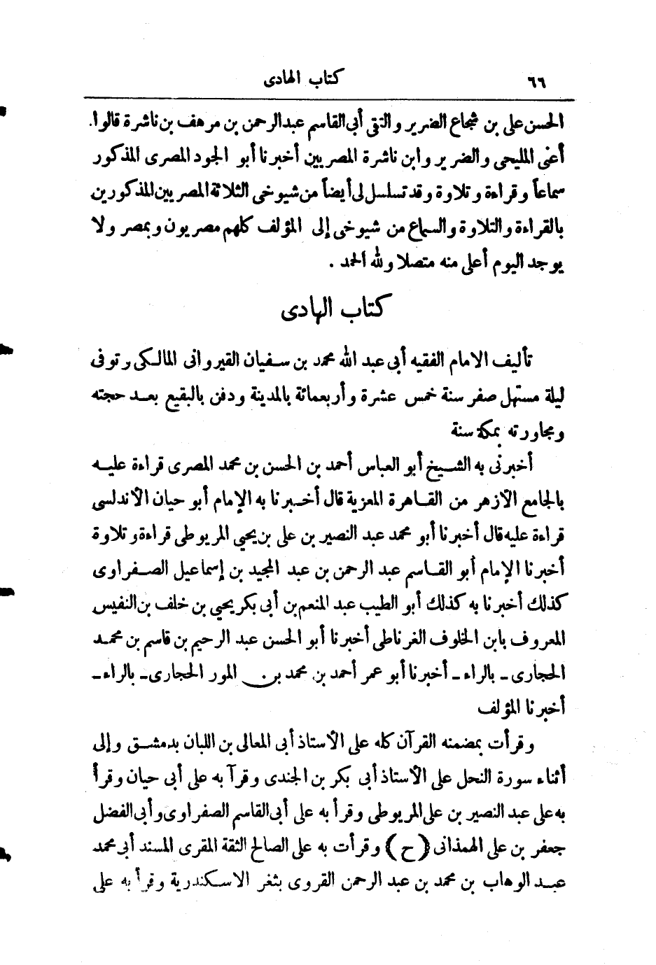 أَخْبَرَنِي بِهِ شَيْخِي أَبُو الْعَبَّاسِ أَحْمَدُ بْنُ الْحَسَنِ بْنِ مُحَمَّدٍ الْمِصْرِيُّ قِرَاءَةً عَلَيْهِ بِالْجَامِعِ الْأَزْهَرِ مِنَ الْقَاهِرَةِ الْمُعِزِّيَّةِ قَالَ: أَخْبَرَنَا بِهِ الْإِمَامُ أَبُو حَيَّانَ الْأَنْدَلُسِيُّ قِرَاءَةً عَلَيْهِ قَالَ: أَخْبَرَنَا أَبُو مُحَمَّدٍ عَبْدُ النَّصِيرِ بْنُ عَلِيِّ بْنِ يَحْيَى الْمَرْيُوطِيُّ قِرَاءَةً وَتِلَاوَةً، أَخْبَرَنَا الْإِمَامُ أَبُو الْقَاسِمِ عَبْدُ الرَّحْمَنِ بْنُ عَبْدِ الْمَجِيدِ بْنِ إِسْمَاعِيلَ الصَّفْرَاوِيُّ كَذَلِكَ، أَخْبَرَنَا بِهِ كَذَلِكَ أَبُو الطَّيِّبِ عَبْدُ الْمُنْعِمِ بْنُ أَبِي بَكْرٍ يَحْيَى بْنِ خَلَفِ بْنِ النَّفِيسِ الْمَعْرُوفِ بِابْنِ الْخَلُوفِ الْغَرْنَاطِيِّ، أَخْبَرَنَا أَبُو الْحَسَنِ عَبْدُ الرَّحِيمِ بْنُ قَاسِمِ بْنِ مُحَمَّدٍ الْحَجَّارِيُّ - بِالرَّاءِ -، أَخْبَرَنَا أَبُو عُمَرَ أَحْمَدُ بْنُ مُحَمَّدِ بْنِ الْمَوْرِ الْحَجَّارِيُّ - بِالرَّاءِ -، أَخْبَرَنَا الْمُؤَلِّفُ.