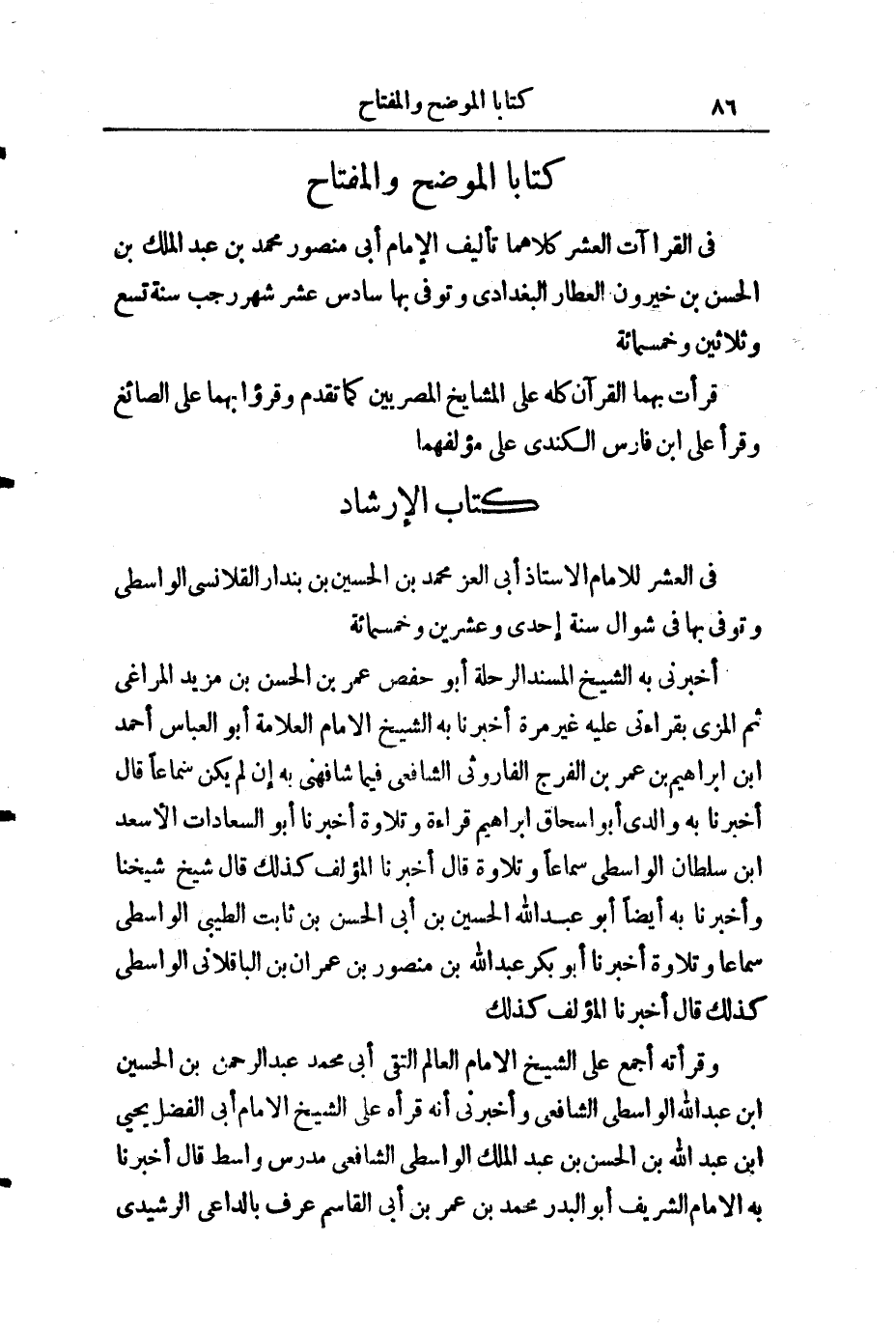 وَقَرَأْتُهُ أَجْمَعَ عَلَى الشَّيْخِ الْإِمَامِ الْعَالِمِ التَّقِيِّ أَبِي مُحَمَّدٍ عَبْدِ الرَّحْمَنِ بْنِ الْحُسَيْنِ بْنِ عَبْدِ اللَّهِ الْوَاسِطِيِّ الشَّافِعِيِّ، وَأَخْبَرَنِي أَنَّهُ قَرَأَهُ عَلَى الشَّيْخِ الْإِمَامِ أَبِي الْفَضْلِ يَحْيَى بْنِ عَبْدِ اللَّهِ بْنِ الْحَسَنِ بْنِ عَبْدِ الْمَلِكِ الْوَاسِطِيِّ الشَّافِعِيِّ مُدَرِّسِ وَاسِطَ قَالَ: أَخْبَرَنَا بِهِ الْإِمَامُ الشَّرِيفُ أَبُو الْبَدْرِ مُحَمَّدُ بْنُ عُمَرَ بْنِ أَبِي الْقَاسِمِ عُرِفَ بِالدَّاعِي الرَّشِيدِيِّ