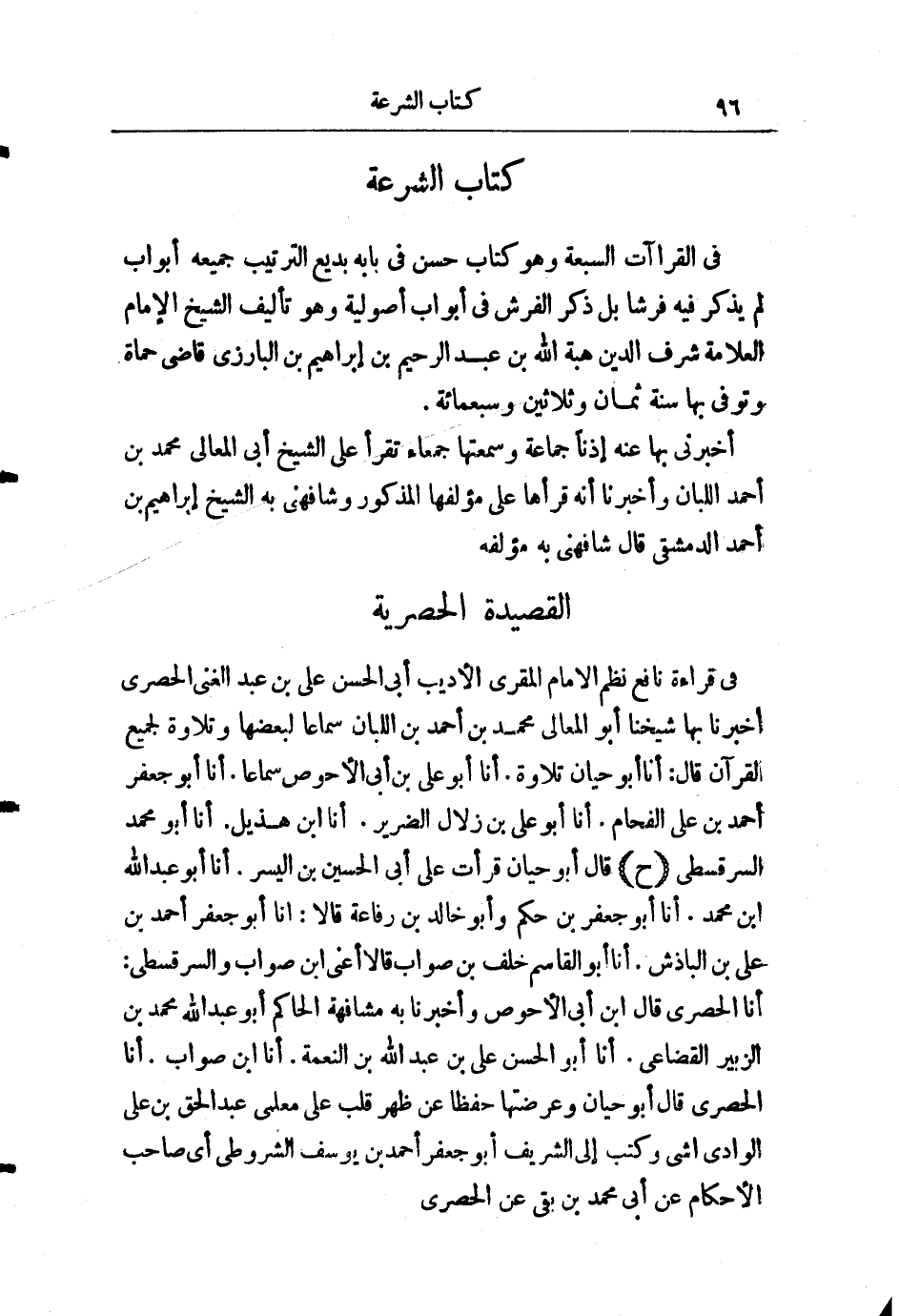 نَظْمُ الْإِمَامِ الْمُقْرِي الْأَدِيبِ أَبِي الْحَسَنِ عَلِيِّ بْنِ عَبْدِ الْغَنِيِّ الْحُصْرِيِّ، أَخْبَرَنَا بِهَا شَيْخُنَا أَبُو الْمَعَالِي مُحَمَّدُ بْنُ أَحْمَدَ بْنِ اللَّبَّانِ سَمَاعًا لِبَعْضِهَا وَتِلَاوَةً لِجَمِيعِ الْقُرْآنِ قَالَ: أَنَا أَبُو عَلِيِّ بْنُ أَبِي الْأَحْوَصِ سَمَاعًا، أَنَا أَبُو جَعْفَرٍ أَحْمَدُ بْنُ عَلِيٍّ الْفَحَّامُ، أَنَا أَبُو عَلِيِّ بْنُ زُلَالٍ الضَّرِيرُ، أَنَا ابْنُ هُذَيْلٍ، أَنَا أَبُو مُحَمَّدٍ السَّرَقُسْطِيُّ (ح) ، قَالَ أَبُو حَيَّانَ قَرَأْتُ عَلَى أَبِي الْحُسَيْنِ بْنِ الْيُسْرِ، أَنَا أَبُو عَبْدِ اللَّهِ بْنُ مُحَمَّدٍ، أَنَا أَبُو جَعْفَرِ بْنُ حَكَمٍ وَأَبُو خَالِدِ بْنُ رِفَاعَةَ قَالَا: أَنَا أَبُو جَعْفَرٍ أَحْمَدُ بْنُ عَلِيِّ بْنِ الْبَاذِشِ، أَنَا أَبُو الْقَاسِمِ خَلَفُ بْنُ صَوَابٍ قَالَا - أَعْنِي ابْنَ صَوَابٍ وَالسَّرَقُسْطِيَّ -: أَنَا الْحُصْرِيُّ، قَالَ ابْنُ أَبِي الْأَحْوَصِ وَأَخْبَرَنَا بِهِ مُشَافَهَةً الْحَاكِمُ أَبُو عَبْدِ اللَّهِ مُحَمَّدُ بْنُ الزُّبَيْرِ الْقُضَاعِيُّ، أَنَا أَبُو الْحَسَنِ عَلِيُّ بْنُ عَبْدِ اللَّهِ بْنِ النِّعْمَةِ، أَنَا ابْنُ صَوَابٍ، أَنَا الْحُصْرِيُّ قَالَ أَبُو حَيَّانَ: وَعَرَضْتُهَا حِفْظًا عَنْ ظَهْرِ قَلْبٍ عَلَى مُعَلِّمِي عَبْدِ الْحَقِّ بْنِ عَلِيٍّ الْوَادِي آشِيِّ وَكَتَبَ إِلَيَّ الشَّرِيفُ أَبُو جَعْفَرٍ أَحْمَدُ بْنُ يُوسُفَ الشُّرُوطِيُّ، أَيْ: صَاحِبُ الْأَحْكَامِ عَنْ أَبِي مُحَمَّدِ بْنِ بَقِيٍّ عَنِ الْحُصْرِيِّ.