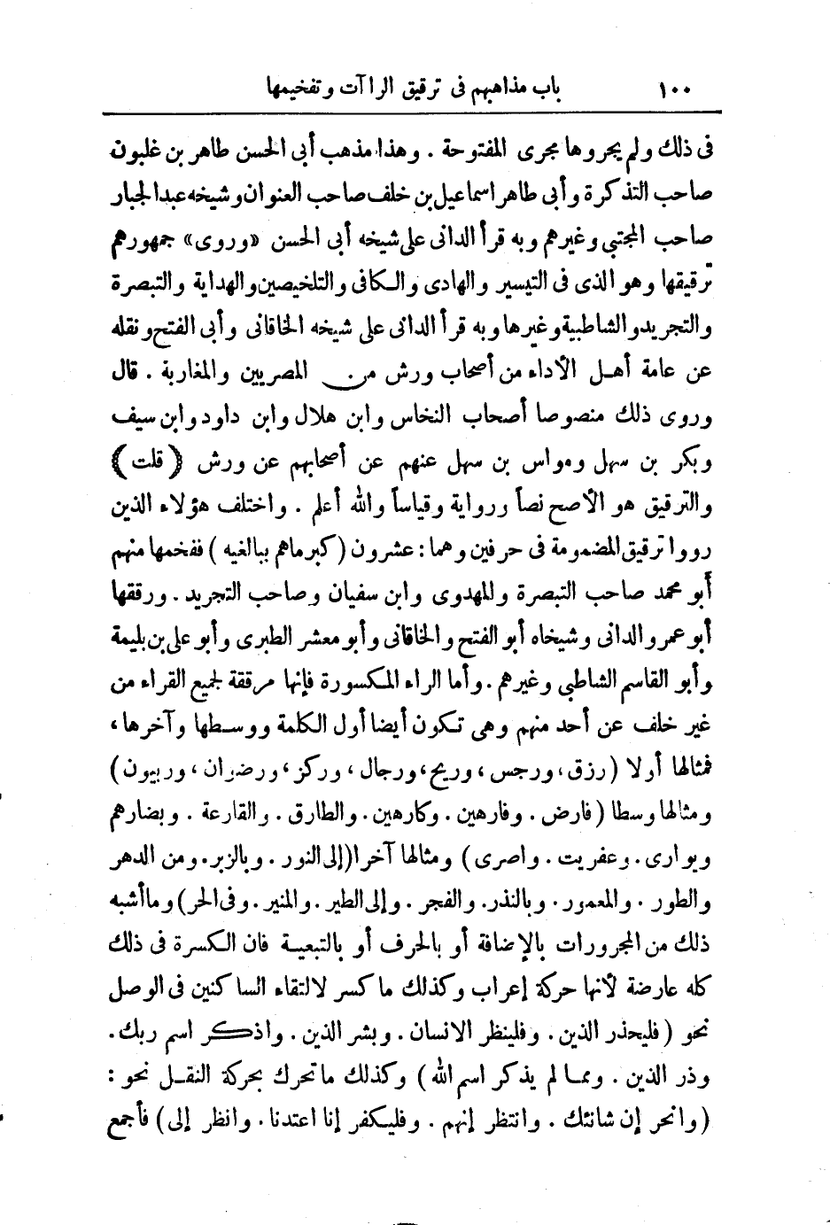 " وَرَوَى " جُمْهُورُهُمْ تَرْقِيقَهَا، وَهُوَ الَّذِي فِي التَّيْسِيرِ وَالْهَادِي، وَالْكَافِي، وَالتَّلْخِيصَيْنِ، وَالْهِدَايَةِ، وَالتَّبْصِرَةِ، وَالتَّجْرِيدِ، وَالشَّاطِبِيَّةِ، وَغَيْرِهَا. وَبِهِ قَرَأَ الدَّانِيُّ عَلَى شَيْخِهِ الْخَاقَانِيِّ وَأَبِي الْفَتْحِ وَنَقَلَهُ عَنْ عَامَّةِ أَهْلِ الْأَدَاءِ مِنْ أَصْحَابِ وَرْشٍ مِنَ الْمِصْرِيِّينَ، وَالْمَغَارِبَةِ. قَالَ: وَرَوَى ذَلِكَ مَنْصُوصًا أَصْحَابُ النَّخَّاسِ وَابْنُ هِلَالٍ وَابْنُ دَاوُدَ وَابْنُ سَيْفٍ وَبَكْرُ بْنُ سَهْلٍ وَمُوَاسُ بْنُ سَهْلٍ عَنْهُمْ عَنْ أَصْحَابِهِمْ عَنْ وَرْشٍ.