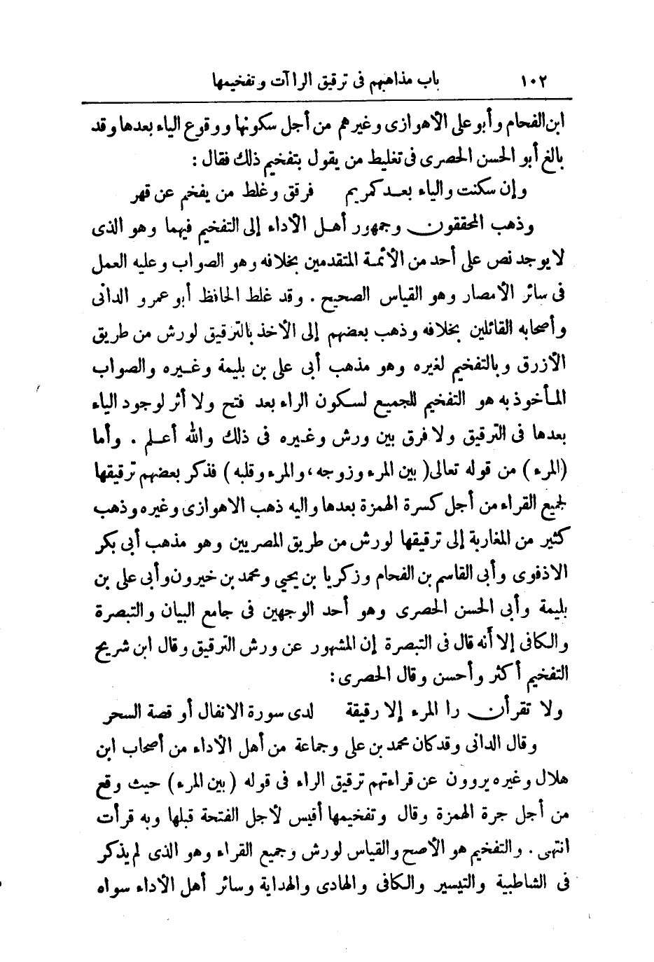 ابْنُ الْفَحَّامِ وَأَبُو عَلِيٍّ الْأَهْوَازِيُّ، وَغَيْرُهُمْ مِنْ أَجْلِ سُكُونِهَا وَوُقُوعِ الْيَاءِ بَعْدَهَا، وَقَدْ بَالَغَ أَبُو الْحَسَنِ الْحُصْرِيُّ فِي تَغْلِيطِ مَنْ يَقُولُ بِتَفْخِيمِ ذَلِكَ فَقَالَ: