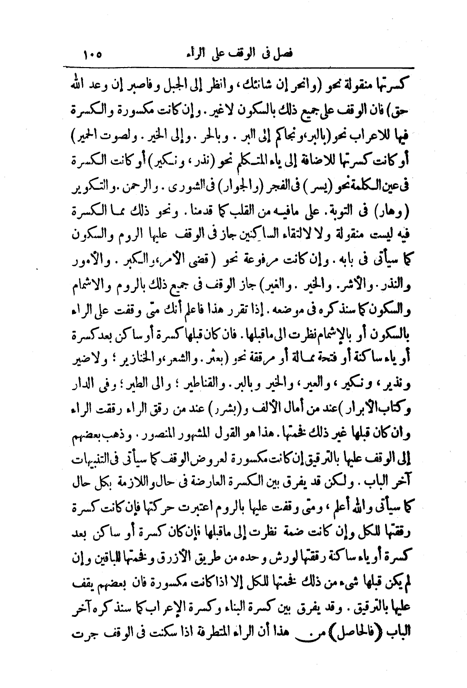 كَسْرَتُهَا مَنْقُولَةً نَحْوَ (وَانْحَرِ انَّ شَانِئَكَ) ، وَ (انْظُرِ الَى الْجَبَلِ) وَ (فَاصْبِرِ انَّ وَعْدَ اللَّهِ حَقٌّ) فَإِنَّ الْوَقْفَ عَلَى جَمِيعِ ذَلِكَ بِالسُّكُونِ لَا غَيْرَ - وَإِنْ كَانَتْ مَكْسُورَةً - وَالْكَسْرَةُ فِيهَا لِلْإِعْرَابِ نَحْوُ بِالْبِرِّ، وَنَجَّاكُمْ إِلَى الْبَرِّ. وَبِالْحُرِّ. وَإِلَى الْخَيْرِ. وَلَصَوْتُ الْحَمِيرِ، أَوْ كَانَتْ كَسْرَتُهَا لِلْإِضَافَةِ إِلَى يَاءِ الْمُتَكَلِّمِ نَحْوَ نَذْرٍ، وَنَكِيرِ، أَوْ كَانَتِ الْكَسْرَةُ فِي عَيْنِ الْكَلِمَةِ نَحْوَ يَسْرِ فِي الْفَجْرِ وَالْجَوَارِ فِي الشُّورَى وَالرَّحْمَنِ وَالتَّكْوِيرِ وَهَارٍ فِي التَّوْبَةِ عَلَى مَا فِيهِ مِنَ الْقَلْبِ كَمَا قَدَّمْنَا، وَنَحْوَ ذَلِكَ مِمَّا الْكَسْرَةُ فِيهِ لَيْسَتْ مَنْقُولَةً، وَلَا لِالْتِقَاءِ السَّاكِنَيْنِ جَازَ فِي الْوَقْفِ عَلَيْهَا الرَّوْمُ وَالسُّكُونُ كَمَا سَيَأْتِي فِي بَابِهِ. وَإِنْ كَانَتْ مَرْفُوعَةً نَحْوُ قُضِيَ الْأَمْرُ، وَالْكِبَرُ. وَالْأُمُورُ وَالنُّذُرُ. وَالْأَشِرُ. وَالْخَيْرُ. وَالْعِيرُ جَازَ الْوَقْفُ فِي جَمِيعِ ذَلِكَ بِالرَّوْمِ، وَالْإِشْمَامِ وَالسُّكُونِ كَمَا سَنَذْكُرُهُ فِي مَوْضِعِهِ. إِذَا تَقَرَّرَ هَذَا فَاعْلَمْ أَنَّكَ مَتَى وَقَفْتَ عَلَى الرَّاءِ بِالسُّكُونِ، أَوْ بِالْإِشْمَامِ نَظَرْتَ إِلَى مَا قَبْلَهَا. فَإِنْ كَانَ قَبْلَهَا كَسْرَةٌ، أَوْ سَاكِنٌ بَعْدَ كَسْرَةٍ، أَوْ يَاءٌ سَاكِنَةٌ، أَوْ فَتْحَةٌ مُمَالَةٌ، أَوْ مُرَقَّقَةٌ نَحْوَ بُعْثِرَ. وَالشِّعْرَ، وَالْخَنَازِيرَ ; وَلَا ضَيْرَ وَنَذِيرٍ، وَنَكِيرِ، وَالْعِيرُ، وَالْخَيْرُ وَبِالْبِرِّ. وَالْقَنَاطِيرِ، وَإِلَى الطَّيْرِ، وَفِي الدَّارِ وَكِتَابَ الْأَبْرَارِ عِنْدَ مَنْ أَمَالَ الْأَلِفَ وَبِشَرَرٍ عِنْدَ مَنْ رَقَّقَ الرَّاءَ رُقِّقَتِ الرَّاءُ، وَإِنْ كَانَ قَبْلَهَا غَيْرُ ذَلِكَ فَخَّمْتَهَا. هَذَا هُوَ الْقَوْلُ الْمَشْهُورُ الْمَنْصُورُ.