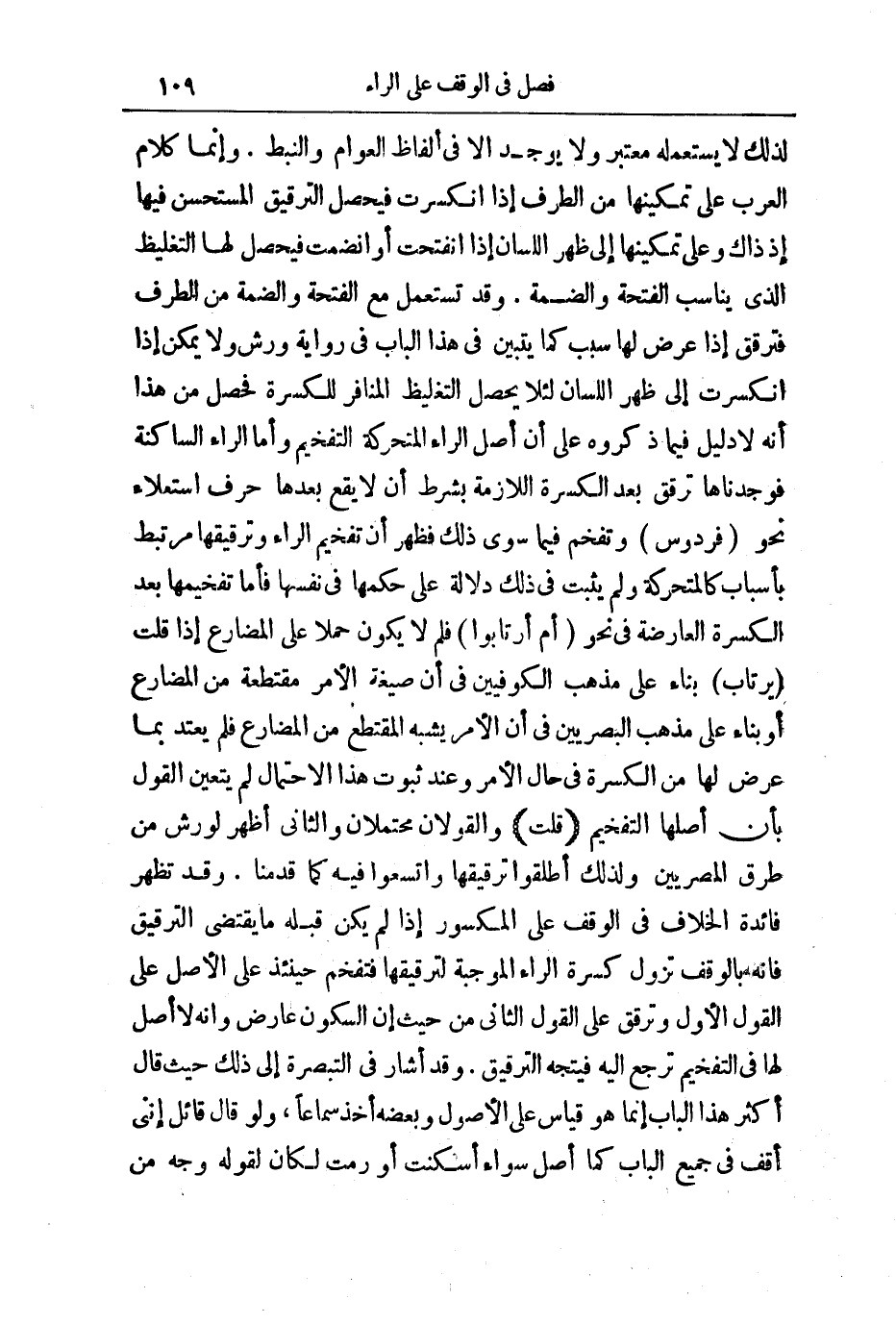 وَقَدْ تُسْتَعْمَلُ مَعَ الْفَتْحَةِ وَالضَّمَّةِ مِنَ الطَّرَفِ فَتُرَقَّقُ إِذَا عَرَضَ لَهَا سَبَبٌ كَمَا يَتَبَيَّنُ فِي هَذَا الْبَابِ فِي رِوَايَةِ وَرْشٍ، وَلَا يُمْكِنُ إِذَا انْكَسَرَتْ إِلَى ظَهْرِ اللِّسَانِ ; لِئَلَّا يَحْصُلَ التَّغْلِيظُ الْمُنَافِرُ لِلْكَسْرَةِ فَحَصَلَ مِنْ هَذَا أَنَّهُ لَا دَلِيلَ فِيمَا ذَكَرُوهُ عَلَى أَنَّ أَصْلَ الرَّاءِ الْمُتَحَرِّكَةِ التَّفْخِيمُ، وَأَمَّا الرَّاءُ السَّاكِنَةُ فَوَجَدْنَاهَا تُرَقَّقُ بَعْدَ الْكَسْرَةِ اللَّازِمَةِ بِشَرْطِ أَنْ لَا يَقَعَ بَعْدَهَا حَرْفُ اسْتِعْلَاءٍ نَحْوَ فِرْدُوسِ وَتُفَخَّمُ فِيمَا سِوَى ذَلِكَ فَظَهَرَ أَنَّ تَفْخِيمَ الرَّاءِ وَتَرْقِيقَهَا مُرْتَبِطٌ بِأَسْبَابٍ كَالْمُتَحَرِّكَةِ، وَلَمْ يَثْبُتْ فِي ذَلِكَ دَلَالَةً عَلَى حُكْمِهَا فِي نَفْسِهَا فَأَمَّا تَفْخِيمُهَا بَعْدَ الْكَسْرَةِ الْعَارِضَةِ فِي نَحْوِ أَمِ ارْتَابُوا فَلِمَ لَا يَكُونُ حَمْلًا عَلَى الْمُضَارِعِ إِذْ قُلْتَ يَرْتَابَ بِنَاءً عَلَى مَذْهَبِ الْكُوفِيِّينَ فِي أَنَّ صِيغَةَ الْأَمْرِ مُقْتَطَعَةٌ مِنَ الْمُضَارِعِ، أَوْ بِنَاءً عَلَى مَذْهَبِ الْبَصْرِيِّينَ فِي أَنَّ الْأَمْرَ يُشْبِهُ الْمَقْطَعَ مِنَ الْمُضَارِعِ فَلَمْ يُعْتَدَّ بِمَا عَرَضَ لَهَا مِنَ الْكَسْرَةِ فِي حَالِ الْأَمْرِ، وَعِنْدَ ثُبُوتِ هَذَا الِاحْتِمَالِ لَمْ يَتَعَيَّنِ الْقَوْلُ بِأَنَّ أَصْلَهَا التَّفْخِيمُ.