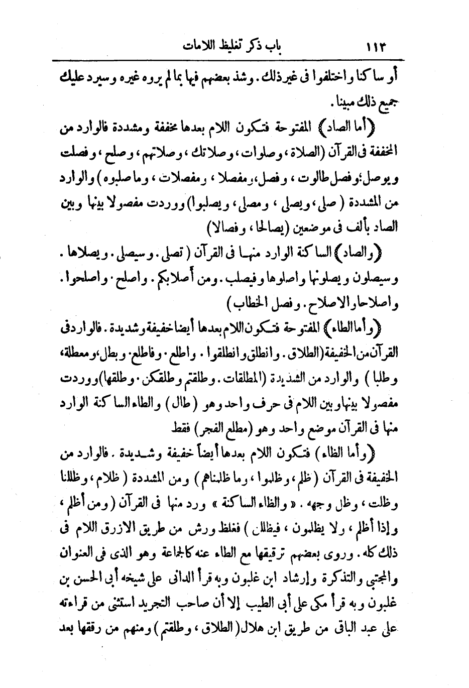 " وَالظَّاءُ السَّاكِنَةُ " وَرَدَ مِنْهَا فِي الْقُرْآنِ وَمَنْ أَظْلَمُ، وَإِذَا أَظْلَمَ، وَلَا يُظْلَمُونَ، فَيَظْلَلْنَ فَغَلَّظَ وَرْشٌ مِنْ طَرِيقِ الْأَزْرَقِ اللَّامَ فِي ذَلِكَ كُلِّهِ. وَرَوَى بَعْضُهُمْ تَرْقِيقَهَا مَعَ الطَّاءِ عَنْهُ كَالْجَمَاعَةِ، وَهُوَ الَّذِي فِي الْعُنْوَانِ وَالْمُجْتَبَى وَالتَّذْكِرَةِ، وَإِرْشَادِ ابْنِ غَلْبُونَ، وَبِهِ قَرَأَ الدَّانِيُّ عَلَى شَيْخِهِ أَبِي الْحَسَنِ بْنِ غَلْبُونَ، وَبِهِ قَرَأَ مَكِّيٌّ عَلَى أَبِي الطِّيبِ إِلَّا أَنَّ صَاحِبَ التَّجْرِيدِ اسْتَثْنَى مِنْ قِرَاءَتِهِ عَلَى عَبْدِ الْبَاقِي مِنْ طَرِيقِ ابْنِ هِلَالٍ الطَّلَاقَ، وَطَلَّقْتُمُ، وَمِنْهُمْ مَنْ رَقَّقَهَا بَعْدَ
