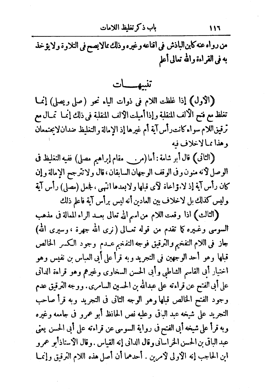 (الْأَوَّلُ) : إِذَا غُلِّظَتِ اللَّامُ فِي ذَوَاتِ الْيَاءِ نَحْوَ صَلَّى وَيَصْلَى إِنَّمَا تُغَلَّظُ مَعَ فَتْحِ الْأَلِفِ الْمُنْقَلِبَةِ، وَإِذَا أُمِيلَتِ الْأَلِفُ الْمُنْقَلِبَةُ فِي ذَلِكَ إِنَّمَا تُمَالُ مَعَ تَرْقِيقِ اللَّامِ سَوَاءٌ كَانَتْ رَأْسَ آيَةٍ أَمْ غَيْرَهَا إِذِ الْإِمَالَةُ وَالتَّغْلِيظُ ضِدَّانِ لَا يَجْتَمِعَانِ، وَهَذَا مِمَّا لَا خِلَافَ فِيهِ.