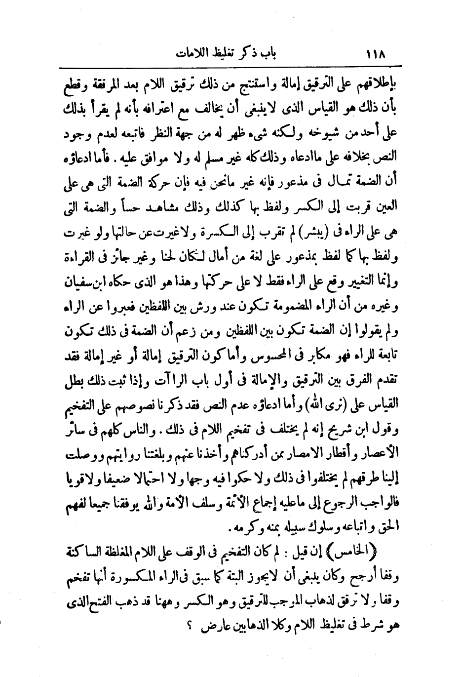 (الْخَامِسُ) إِنْ قِيلَ: لِمَ كَانَ التَّفْخِيمُ فِي الْوَقْفِ عَلَى اللَّامِ الْمُغَلَّظَةِ السَّاكِنَةِ وَقْفًا أَرْجَحَ وَكَانَ يَنْبَغِي أَنْ لَا يَجُوزَ أَلْبَتَّةَ كَمَا سَبَقَ فِي الرَّاءِ الْمَكْسُورَةِ أَنَّهَا تُفَخَّمُ وَقْفًا، وَلَا تُرَقَّقُ لِذَهَابِ الْمُوجِبِ لِلتَّرْقِيقِ، وَهُوَ الْكَسْرُ وَهَاهُنَا قَدْ ذَهَبَ الْفَتْحُ الَّذِي هُوَ شَرْطٌ فِي تَغْلِيظِ اللَّامِ، وَكِلَا الذَّهَابَيْنِ عَارِضٌ؟ .