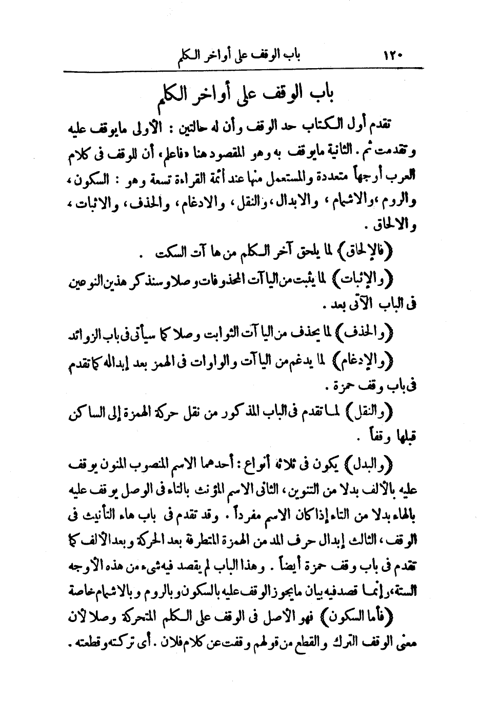 تَقَدَّمَ أَوَّلَ الْكِتَابِ حَدُّ الْوَقْفِ وَأَنَّ لَهُ حَالَتَيْنِ: الْأُولَى مَا يُوقَفُ عَلَيْهِ وَتَقَدَّمَتْ. ثُمَّ الثَّانِيَةُ مَا يُوقَفُ بِهِ، وَهُوَ الْمَقْصُودُ هُنَا " فَاعْلَمْ " أَنَّ لِلْوَقْفِ فِي كَلَامِ الْعَرَبِ أَوْجُهًا مُتَعَدِّدَةً وَالْمُسْتَعْمَلُ مِنْهَا عِنْدَ أَئِمَّةِ الْقِرَاءَةِ تِسْعَةٌ، وَهُوَ: السُّكُونُ، وَالرَّوْمُ، وَالْإِشْمَامُ، وَالْإِبْدَالُ، وَالنَّقْلُ، وَالْإِدْغَامُ، وَالْحَذْفُ، وَالْإِثْبَاتُ، وَالْإِلْحَاقُ.