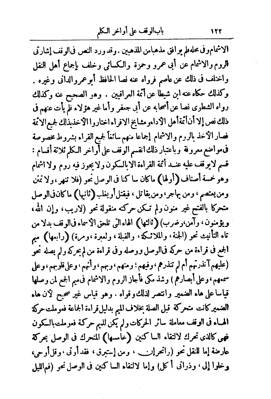 الْإِشْمَامِ، وَفِي مَحَلِّهِ فَلَمْ يُوَافِقْ مَذْهَبًا مِنَ الْمَذْهَبَيْنِ. وَقَدْ وَرَدَ النَّصُّ فِي الْوَقْفِ إِشَارَتَيِ الرَوْمِ، وَالْإِشْمَامِ عَنْ أَبِي عَمْرٍو وَحَمْزَةَ وَالْكِسَائِيِّ وَخَلَفٍ بِإِجْمَاعِ أَهْلِ النَّقْلِ، وَاخْتُلِفَ فِي ذَلِكَ عَنْ عَاصِمٍ فَرَوَاهُ عَنْهُ نَصًّا الْحَافِظُ أَبُو عَمْرٍو وَالدَّانِيُّ، وَغَيْرُهُ. وَكَذَلِكَ حَكَاهُ عَنْهُ ابْنُ شَيْطٍ عَنْ أَئِمَّةِ الْعِرَاقِيِّينَ. وَهُوَ الصَّحِيحُ عَنْهُ، وَكَذَلِكَ رَوَاهُ الشَّطَوِيُّ نَصًّا عَنْ أَصْحَابِهِ عَنْ أَبِي جَعْفَرٍ، وَأَمَّا غَيْرُ هَؤُلَاءِ فَلَمْ يَأْتِ عَنْهُمْ فِي ذَلِكَ نَصٌّ إِلَّا أَنَّ أَئِمَّةَ أَهْلِ الْأَدَاءِ وَمَشَايِخَ الْإِقْرَاءِ اخْتَارُوا الْأَخْذَ بِذَلِكَ لِجَمِيعِ الْأَئِمَّةِ فَصَارَ الْأَخْذُ بِالرَّوْمِ، وَالْإِشْمَامِ إِجْمَاعًا مِنْهُمْ سَائِغًا لِجَمِيعِ الْقُرَّاءِ بِشُرُوطٍ مَخْصُوصَةٍ فِي مَوَاضِعَ مَعْرُوفَةٍ وَبِاعْتِبَارِ ذَلِكَ انْقَسَمَ الْوَقْفُ عَلَى أَوَاخِرِ الْكَلِمِ ثَلَاثَةَ أَقْسَامٍ: قِسْمٌ لَا يُوقَفُ عَلَيْهِ عِنْدَ أَئِمَّةِ الْقِرَاءَةِ إِلَّا بِالسُّكُونِ، وَلَا يَجُوزُ فِيهِ رَوْمٌ، وَلَا إِشْمَامٌ، وَهُوَ خَمْسَةُ أَصْنَافٍ: