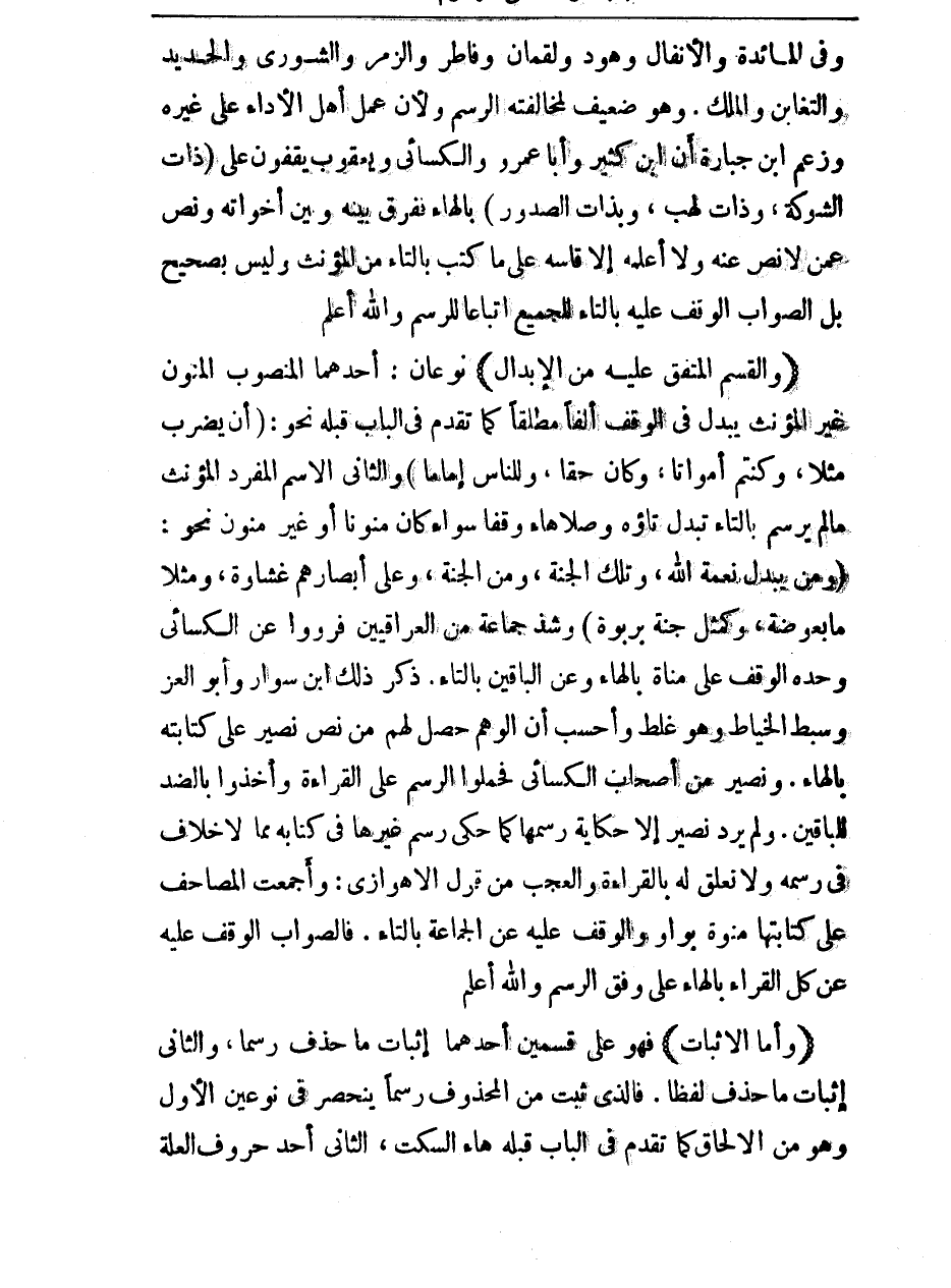 ، وَفِي الْمَائِدَةِ وَالْأَنْفَالِ، وَهُودٍ وَلُقْمَانَ وَفَاطِرٍ وَالزُّمَرِ وَالشُّورَى وَالْحَدِيدِ وَالتَّغَابُنِ وَالْمُلْكِ. وَهُوَ ضَعِيفٌ لِمُخَالَفَتِهِ الرَّسْمَ، وَلِأَنَّ عَمَلَ أَهْلِ الْأَدَاءِ عَلَى غَيْرِهِ وَزَعَمَ ابْنُ جُبَارَةَ أَنَّ ابْنَ كَثِيرٍ وَأَبَا عَمْرٍو وَالْكِسَائِيَّ وَيَعْقُوبَ، يَقِفُونَ عَلَى ذَاتِ الشَّوْكَةِ، وَذَاتَ لَهَبٍ، وَبِذَاتِ الصُّدُورِ بِالْهَاءِ فَفَرَّقَ بَيْنَهُ وَبَيْنَ أَخَوَاتِهِ، وَنَصَّ عَمَّنْ لَا نَصَّ عَنْهُ، وَلَا أَعْلَمُهُ إِلَّا قَاسَهُ عَلَى مَا كُتِبَ بِالتَّاءِ مِنَ الْمُؤَنَّثِ وَلَيْسَ بِصَحِيحٍ، بَلِ الصَّوَابُ الْوَقْفُ عَلَيْهِ بِالتَّاءِ لِلْجَمِيعِ اتِّبَاعًا لِلرَّسْمِ - وَاللَّهُ أَعْلَمُ -.