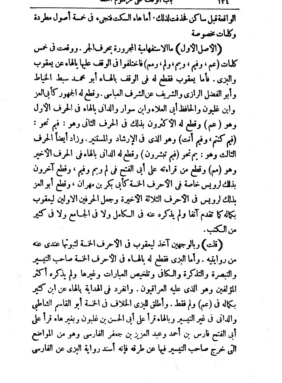 (الْأَصْلُ الْأَوَّلُ) مَا الِاسْتِفْهَامِيَّةُ الْمَجْرُورَةُ بِحَرْفِ الْجَرِّ. وَوَقَعَتْ فِي خَمْسِ كَلِمَاتٍ عَمَّ، وَفِيمَ، وَبِمَ، وَلَمْ، وَمِمَّ فَاخْتَلَفُوا فِي الْوَقْفِ عَلَيْهَا بِالْهَاءِ عَنْ يَعْقُوبَ وَالْبَزِّيِّ. فَأَمَّا يَعْقُوبُ فَقَطَعَ لَهُ فِي الْوَقْفِ بِالْهَاءِ أَبُو مُحَمَّدٍ سِبْطُ الْخَيَّاطِ وَأَبُو الْفَضْلِ الرَّازِيُّ وَالشَّرِيفُ عَنِ الشَّرَفِ الْعَبَّاسِيِّ. وَقَطَعَ لَهُ الْجُمْهُورُ كَأَبِي الْعِزِّ وَابْنِ غَلْبُونَ وَالْحَافِظِ أَبِي الْعَلَاءِ وَابْنِ سَوَّارٍ وَالدَّانِيِّ بِالْهَاءِ فِي الْحَرْفِ الْأَوَّلِ، وَهُوَ عَمَّ، وَقَطَعَ لَهُ الْأَكْثَرُونَ بِذَلِكَ فِي الْحَرْفِ الثَّانِي، وَهُوَ: فِيمَ نَحْوَ: فِيمَ كُنْتُمْ، وَفِيمَ أَنْتَ، وَهُوَ الَّذِي فِي الْإِرْشَادِ وَالْمُسْتَنِيرِ. وَزَادَ أَيْضًا الْحَرْفُ الثَّالِثُ، وَهُوَ: بِمَ نَحْوَ فَبِمَ تُبَشِّرُونِ، وَقَطَعَ لَهُ الدَّانِيُّ بِالْهَاءِ فِي الْحَرْفِ الْأَخِيرِ، وَهُوَ مِمَّ، وَقَطَعَ مَنْ قِرَاءَتُهُ عَلَى أَبِي الْفَتْحِ فِي لِمَ وَبِمَ، وَفِيمَ، وَقَطَعَ آخَرُونَ بِذَلِكَ لِرُوَيْسٍ خَاصَّةً فِي الْأَحْرُفِ الْخَمْسَةِ كَأَبِي بَكْرِ بْنِ مِهْرَانَ، وَقَطَعَ أَبُو الْعِزِّ بِذَلِكَ لِرُوَيْسٍ فِي الْأَحْرُفِ الثَّلَاثَةِ الْأَخِيرَةِ وَجَعَلَ الْحَرْفَيْنِ الْأَوَّلِينَ لِيَعْقُوبَ بِكَمَالِهِ كَمَا تَقَدَّمَ آنِفًا، وَلَمْ يَذْكُرْهُ عَنْهُ فِي الْكَامِلِ، وَلَا فِي الْجَامِعِ، وَلَا فِي كَثِيرٍ مِنَ الْكُتُبِ.