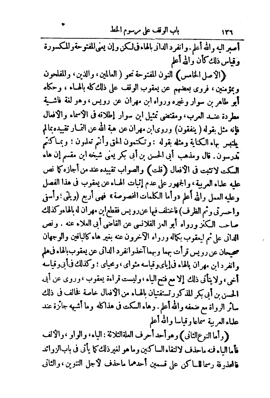 (الْأَصْلُ الْخَامِسُ) النُّونُ الْمَفْتُوحَةُ نَحْوَ الْعَالَمِينَ، وَالَّذِينَ، وَالْمُفْلِحُونَ، وَبِمُؤْمِنِينَ، فَرَوَى بَعْضُهُمْ عَنْ يَعْقُوبَ الْوَقْفَ عَلَى ذَلِكَ كُلِّهِ بِالْهَاءِ، وَحَكَاهُ أَبُو طَاهِرِ بْنُ سَوَّارٍ، وَغَيْرُهُ، وَرَوَاهُ ابْنُ مِهْرَانَ عَنْ رُوَيْسٍ، وَهُوَ لُغَةٌ فَاشِيَةٌ مُطَّرِدَةٌ عِنْدَ الْعَرَبِ، وَمُقْتَضَى تَمْثِيلِ ابْنِ سَوَّارٍ إِطْلَاقُهُ فِي الْأَسْمَاءِ وَالْأَفْعَالِ فَإِنَّهُ مَثَّلَ بُقُولِهِ يُنْفِقُونَ، وَرَوَى ابْنُ مِهْرَانَ عَنْ هِبَةِ اللَّهِ عَنِ التَّمَّارِ تَقْيِيدَهُ بِمَا لَمْ يَلْتَبِسْ بِهَاءِ الْكِنَايَةِ وَمَثَّلَهُ بِقَوْلِهِ: وَتَكْتُمُونَ الْحَقَّ وَأَنْتُمْ تَعْلَمُونَ، وَبِمَا كُنْتُمْ تَدْرُسُونَ. قَالَ: وَمَذْهَبُ أَبِي الْحَسَنِ بْنِ أَبِي بَكْرٍ يَعْنِي شَيْخَهُ ابْنَ مِقْسَمٍ أَنَّ هَاءَ السَّكْتِ لَا تَثْبُتُ فِي الْأَفْعَالِ.