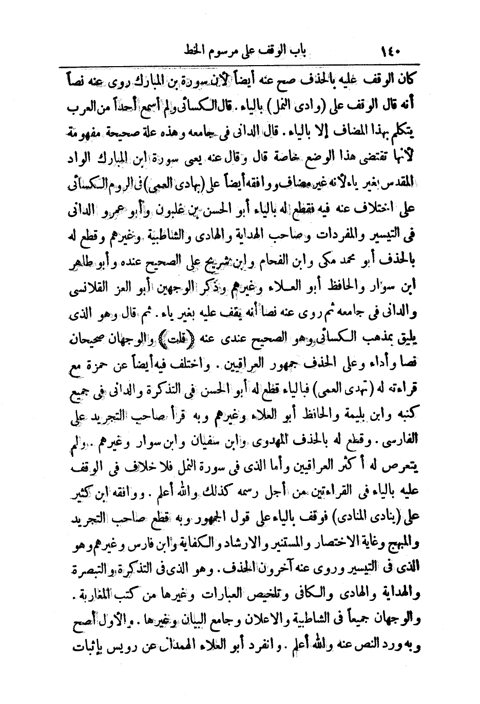 قَالَ الدَّانِيُّ فِي جَامِعِهِ: وَهَذِهِ عِلَّةٌ صَحِيحَةٌ مَفْهُومَةٌ لِأَنَّهَا تَقْتَضِي هَذَا الْوَضْعَ خَاصَّةً قَالَ: وَقَالَ: عَنْهُ يَعْنِي سَوْرَةَ بْنَ الْمُبَارَكِ الْوَادِ الْمُقَدَّسِ بِغَيْرِ يَاءٍ لِأَنَّهُ غَيْرُ مُضَافٍ، وَوَافَقَهُ أَيْضًا عَلَى بِهَادِ الْعُمْيِ فِي الرُّومِ الْكِسَائِيُّ عَلَى اخْتِلَافٍ عَنْهُ، فَقَطَعَ لَهُ بِالْيَاءِ أَبُو الْحَسَنِ بْنُ غَلْبُونَ وَأَبُو عَمْرٍو الدَّانِيُّ فِي التَّيْسِيرِ وَالْمُفْرَدَاتِ، وَصَاحِبُ الْهِدَايَةِ وَالْهَادِي، وَالشَّاطِبِيَّةِ، وَغَيْرُهُمْ، وَقَطَعَ لَهُ بِالْحَذْفِ أَبُو مُحَمَّدٍ مَكِّيٌّ وَابْنُ الْفَحَّامِ وَابْنُ شُرَيْحٍ عَلَى الصَّحِيحِ عِنْدَهُ، وَأَبُو طَاهِرِ ابْنُ سَوَّارٍ وَالْحَافِظُ أَبُو الْعَلَاءِ، وَغَيْرُهُمْ، وَذَكَرَ الْوَجْهَيْنِ أَبُو الْعِزِّ الْقَلَانِسِيُّ وَالدَّانِيُّ فِي جَامِعِهِ ثُمَّ رَوَى عَنْهُ نَصًّا أَنَّهُ يَقِفُ عَلَيْهِ بِغَيْرِ يَاءٍ. ثُمَّ قَالَ: وَهُوَ الَّذِي يَلِيقُ بِمَذْهَبِ الْكِسَائِيِّ، وَهُوَ الصَّحِيحُ عِنْدِي عَنْهُ.