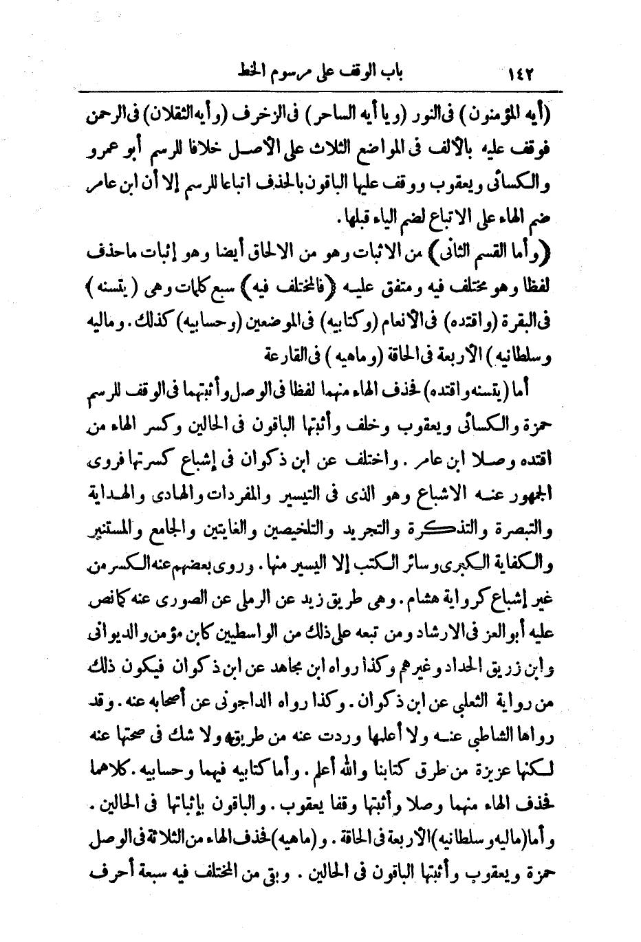 (فَالْمُخْتَلَفُ فِيهِ) سَبْعُ كَلِمَاتٍ، وَهِيَ يَتَسَنَّهْ فِي الْبَقَرَةِ وَاقْتَدِهْ فِي الْأَنْعَامِ وَكِتَابِيَهْ فِي الْمَوْضِعَيْنِ وَحِسَابِيَهْ كَذَلِكَ (وَمَالِيَهْ) وَسُلْطَانِيَهْ الْأَرْبَعَةُ فِي الْحَاقَّةِ، وَمَا هِيَهْ فِي الْقَارِعَةِ أَمَّا يَتَسَنَّهْ وَاقْتَدِهِ فَحَذَفَ الْهَاءَ مِنْهُمَا لَفْظًا فِي الْوَصْلِ وَأَثْبَتَهُمَا فِي الْوَقْفِ لِلرَّسْمِ حَمْزَةُ وَالْكِسَائِيُّ وَيَعْقُوبُ وَخَلَفٌ، وَأَثْبَتَهَا الْبَاقُونَ فِي الْحَالَيْنِ وَكَسَرَ الْهَاءَ مِنَ اقْتَدِهِ وَصْلًا ابْنُ عَامِرٍ. وَاخْتُلِفَ عَنِ ابْنِ ذَكْوَانَ فِي إِشْبَاعِ كَسْرَتِهَا، فَرَوَى الْجُمْهُورُ عَنْهُ الْإِشْبَاعَ، وَهُوَ الَّذِي فِي التَّيْسِيرِ وَالْمُفْرَدَاتِ وَالْهَادِي، وَالْهِدَايَةِ، وَالتَّبْصِرَةِ، وَالتَّذْكِرَةِ، وَالتَّجْرِيدِ، وَالتَّلْخِيصَيْنِ، وَالْغَايَتَيْنِ، وَالْجَامِعِ، وَالْمُسْتَنِيرِ، وَالْكِفَايَةِ الْكُبْرَى، وَسَائِرِ الْكُتُبِ إِلَّا الْيَسِيرَ مِنْهَا. وَرَوَى بَعْضُهُمْ عَنْهُ الْكَسْرَ مِنْ غَيْرِ إِشْبَاعٍ كَرِوَايَةِ هِشَامٍ. وَهِيَ طَرِيقُ زَيْدٍ عَنِ الرَّمْلِيِّ عَنِ الصُّورِيِّ عَنْهُ كَمَا نَصَّ عَلَيْهِ أَبُو الْعِزِّ فِي الْإِرْشَادِ، وَمَنْ تَبِعَهُ عَلَى ذَلِكَ مِنَ الْوَاسِطِيِّينَ كَابْنِ مُؤْمِنٍ وَالدِّيوَانِيِّ وَابْنِ زُرَيْقٍ الْحَدَّادِ، وَغَيْرِهِمْ، وَكَذَا رَوَاهُ ابْنُ مُجَاهِدٍ عَنِ ابْنِ ذَكْوَانَ فَيَكُونُ ذَلِكَ مِنْ رِوَايَةِ الثَّعْلَبِيِّ عَنِ ابْنِ ذَكْوَانَ. وَكَذَا رَوَاهُ الدَّاجُونِيُّ عَنْ أَصْحَابِهِ عَنْهُ. وَقَدْ رَوَاهَا الشَّاطِبِيُّ عَنْهُ، وَلَا أَعْلَمُهَا وَرَدَتْ عَنْهُ مِنْ طَرِيقٍ، وَلَا شَكَّ فِي صِحَّتِهَا عَنْهُ لَكِنَّهَا عَزِيزَةٌ مِنْ طُرُقِ كِتَابِنَا - وَاللَّهُ أَعْلَمُ -.