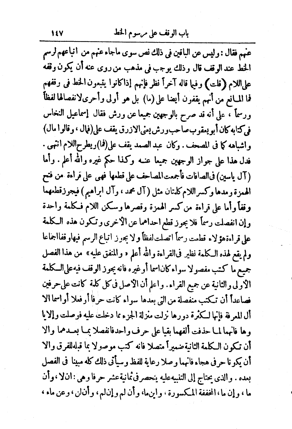 " وَالْمُتَّفَقُ عَلَيْهِ " مِنْ هَذَا الْفَصْلِ جَمِيعُ مَا كُتِبَ مَفْصُولًا سَوَاءٌ كَانَ اسْمًا، أَوْ غَيْرَهُ فَإِنَّهُ يَجُوزُ الْوَقْفُ فِيهِ عَلَى الْكَلِمَةِ الْأُولَى وَالثَّانِيَةِ عَنْ جَمِيعِ الْقُرَّاءِ. وَاعْلَمْ أَنَّ الْأَصْلَ فِي كُلِّ كَلِمَةٍ كَانَتْ عَلَى حَرْفَيْنِ فَصَاعِدًا أَنْ تُكْتَبَ مُنْفَصِلَةً مِنَ الَّتِي بَعْدَهَا سَوَاءٌ كَانَتْ حَرْفًا، أَوْ فِعْلًا، أَوِ اسْمًا إِلَّا آلَ الْمَعْرِفَةِ فَإِنَّهَا لِكَثْرَةِ دَوْرِهَا نُزِّلَتْ مَنْزِلَةَ الْجُزْءِ مِمَّا دَخَلَتْ عَلَيْهِ فَوُصِلَتْ وَإِلَّا يَا وَهَا فَإِنَّهُمَا لَمَّا حُذِفَتْ أَلِفَهُمَا بَقِيَا عَلَى حَرْفٍ وَاحِدٍ فَانْفَصَلَا بِمَا بَعْدَهُمَا وَإِلَّا أَنْ تَكُونَ الْكَلِمَةُ الثَّانِيَةُ ضَمِيرًا مُتَّصِلًا فَإِنَّهُ كُتِبَ مَوْصُولًا بِمَا قَبْلَهُ لِلْفَرْقِ وَإِلَّا أَنْ يَكُونَا حَرْفَيْ هِجَاءٍ إِنَّهُمَا وَصْلًا رِعَايَةً لِلَّفْظِ وَسَيَأْتِي ذَلِكَ كُلُّهُ مُبَيَّنًا فِي الْفَصْلِ بَعْدَهُ.