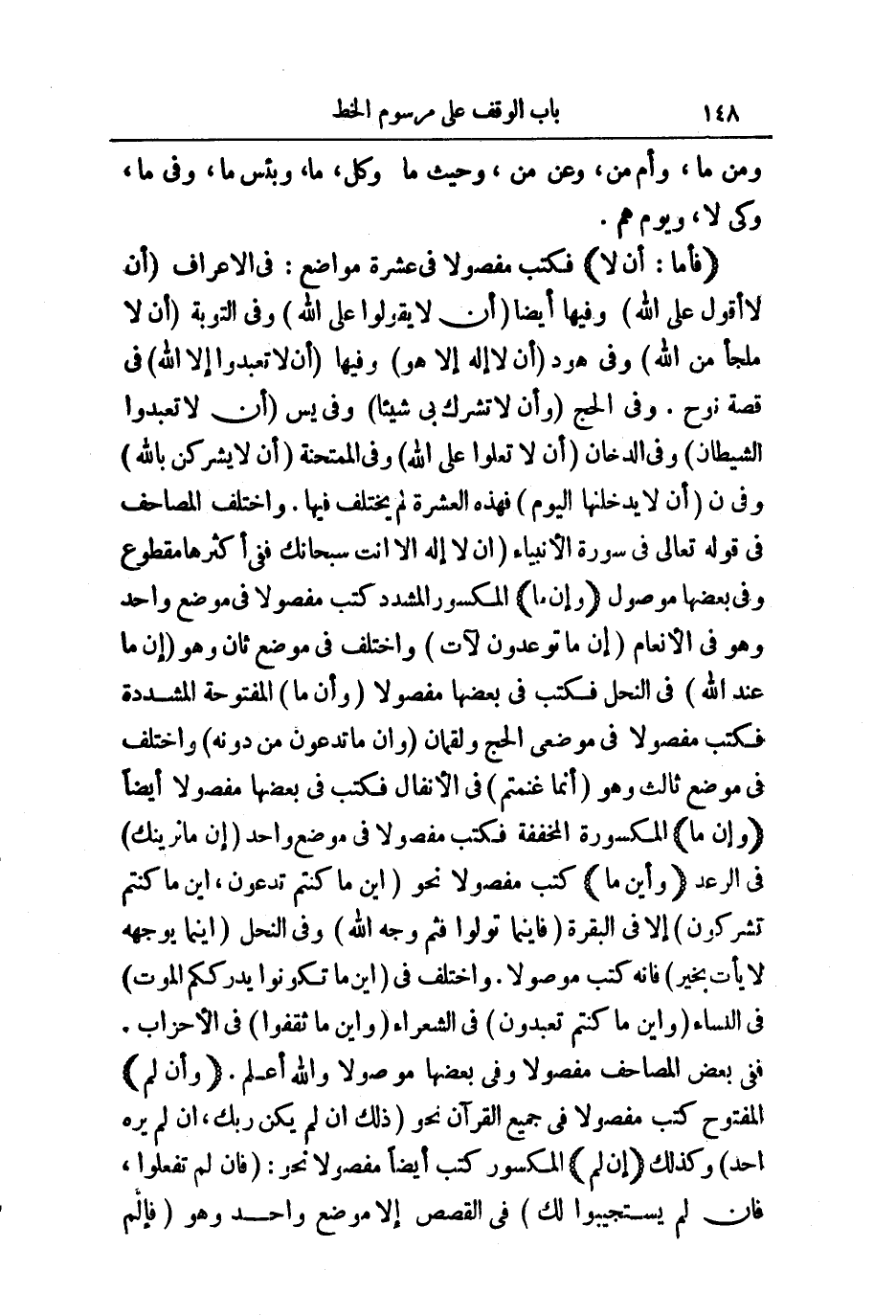 (فَأَمَّا: أَنْ لَا) فَكُتِبَ مَفْصُولًا فِي عَشَرَةِ مَوَاضِعَ: فِي الْأَعْرَافِ أَنْ لَا أَقُولَ عَلَى اللَّهِ، وَفِيهَا أَيْضًا أَنْ لَا يَقُولُوا عَلَى اللَّهِ، وَفِي التَّوْبَةِ أَنْ لَا مَلْجَأَ مِنَ اللَّهِ، وَفِي هُودٍ وَأَنْ لَا إِلَهَ إِلَّا هُوَ، وَفِيهَا أَنْ لَا تَعْبُدُوا إِلَّا اللَّهَ فِي قِصَّةِ نُوحٍ. وَفِي الْحَجِّ وَأَنْ لَا تُشْرِكْ بِي شَيْئًا، وَفِي يس أَنْ لَا تَعْبُدُوا الشَّيْطَانَ، وَفِي الدُّخَانِ أَنْ لَا أَقُولَ عَلَى اللَّهِ، وَفِي الْمُمْتَحِنَةِ أَنْ لَا يُشْرِكْنَ بِاللَّهِ، وَفِي ن أَنْ لَا يَدْخُلَنَّهَا الْيَوْمَ فَهَذِهِ الْعَشَرَةُ لَمْ يُخْتَلَفْ فِيهَا. وَاخْتَلَفَ الْمَصَاحِفُ فِي قَوْلِهِ تَعَالَى: فِي سُورَةِ الْأَنْبِيَاءِ أَنْ لَا إِلَهَ إِلَّا أَنْتَ سُبْحَانَكَ فَفِي أَكْثَرِهَا مَقْطُوعٌ، وَفِي بَعْضِهَا مَوْصُولٌ.
