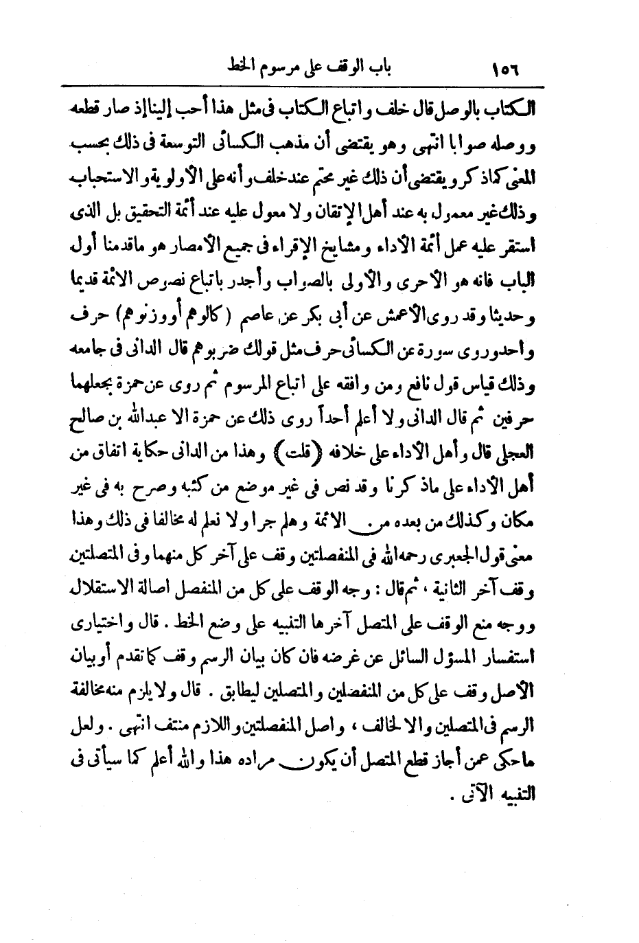 (قُلْتُ) : وَهَذَا مِنَ الدَّانِيِّ حِكَايَةَ اتِّفَاقٍ مِنْ أَهْلِ الْأَدَاءِ عَلَى مَا ذَكَرْنَا، وَقَدْ نَصَّ فِي غَيْرِ مَوْضِعٍ مِنْ كُتُبِهِ، وَصَرَّحَ بِهِ فِي غَيْرِ مَكَانِ، وَكَذَلِكَ مِنْ بَعْدِهِ مِنَ الْأَئِمَّةِ وَهَلُمَّ جَرَّا، وَلَا نَعْلَمُ لَهُ مُخَالِفًا فِي ذَلِكَ، وَهَذَا مَعْنَى قَوْلِ الْجَعْبَرِيِّ رَحِمَهُ اللَّهُ فِي الْمُنْفَصِلَيْنِ وَقَفَ عَلَى آخِرِ كُلٍّ مِنْهُمَا، وَفِي الْمُتَّصِلَتَيْنِ وَقَفَ آخِرَ الثَّانِيَةِ، ثُمَّ قَالَ: وَجْهُ الْوَقْفِ عَلَى كُلٍّ مِنَ الْمُنْفَصِلِ أَصَالَةَ الِاسْتِقْلَالِ وَوَجْهُ مَنْعِ الْوَقْفِ عَلَى الْمُتَّصِلِ آخِرَهَا التَّنْبِيهُ عَلَى وَضْعِ الْخَطِّ. قَالَ: وَاخْتِيَارِي اسْتِفْسَارُ الْمَسْؤُولِ السَّائِلَ عَنْ غَرَضِهِ فَإِنْ كَانَ بَيَانُ الرَّسْمِ وَقَفَ كَمَا تَقَدَّمَ، أَوْ بَيَانُ الْأَصْلِ وَقَفَ عَلَى كُلٍّ مِنَ الْمُنْفَصِلَيْنِ وَالْمُتَّصِلَيْنِ لِيُطَابِقَ. قَالَ: وَلَا يَلْزَمُ مِنْهُ مُخَالَفَةَ الرَّسْمِ فِي الْمُتَّصِلَيْنِ وَإِلَّا لَخَالَفَ، وَأَصْلُ الْمُنْفَصِلَتَيْنِ وَاللَّازِمِ مُنْتَفٍ انْتَهَى. وَلَعَلَّ مَا حَكَى عَمَّنْ أَجَازَ قَطْعَ الْمُتَّصِلِ أَنْ يَكُونَ مُرَادُهُ هَذَا - وَاللَّهُ أَعْلَمُ -.