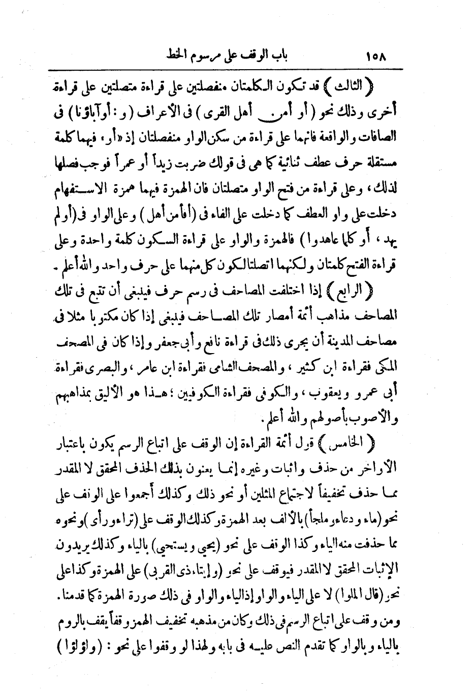 (الْخَامِسُ) قَوْلُ أَئِمَّةِ الْقِرَاءَةِ إِنَّ الْوَقْفَ عَلَى اتِّبَاعِ الرَّسْمِ يَكُونُ بِاعْتِبَارِ الْأَوَاخِرِ مِنْ حَذْفٍ وَإِثْبَاتٍ، وَغَيْرِهِ إِنَّمَا يَعْنُونَ بِذَلِكَ الْحَذْفَ الْمُحَقَّقَ لَا الْمُقَدَّرَ مِمَّا حُذِفَ تَخْفِيفًا لِاجْتِمَاعِ الْمِثْلَيْنِ، أَوْ نَحْوَ ذَلِكَ أَجْمَعُوا عَلَى الْوَقْفِ عَلَى نَحْوِ مَاءً وَدُعَاءً وَمَلْجَأً بِالْأَلِفِ بَعْدَ الْهَمْزَةِ، وَكَذَلِكَ عَلَى الْوَقْفِ عَلَى تَرَاءَ وَرَأَى وَنَحْوَهُ مِمَّا حُذِفَتْ مِنْهُ الْيَاءُ، وَكَذَا الْوَقْفُ عَلَى نَحْوِ يَحْيَى وَيَسْتَحْيِي بِالْيَاءِ، وَكَذَلِكَ يُرِيدُونَ الْإِثْبَاتَ الْمُحَقَّقَ لَا الْمُقَدَّرَ فَيُوقَفُ عَلَى نَحْوِ وَإِيتَاءِ ذَا الْقُرْبَى عَلَى الْهَمْزَةِ، وَكَذَا عَلَى نَحْوِ قَالَ الْمَلَأُ لَا عَلَى الْيَاءِ وَالْوَاوِ إِذِ الْيَاءُ وَالْوَاوُ فِي ذَلِكَ صُورَةُ الْهَمْزَةِ كَمَا قَدَّمْنَا.