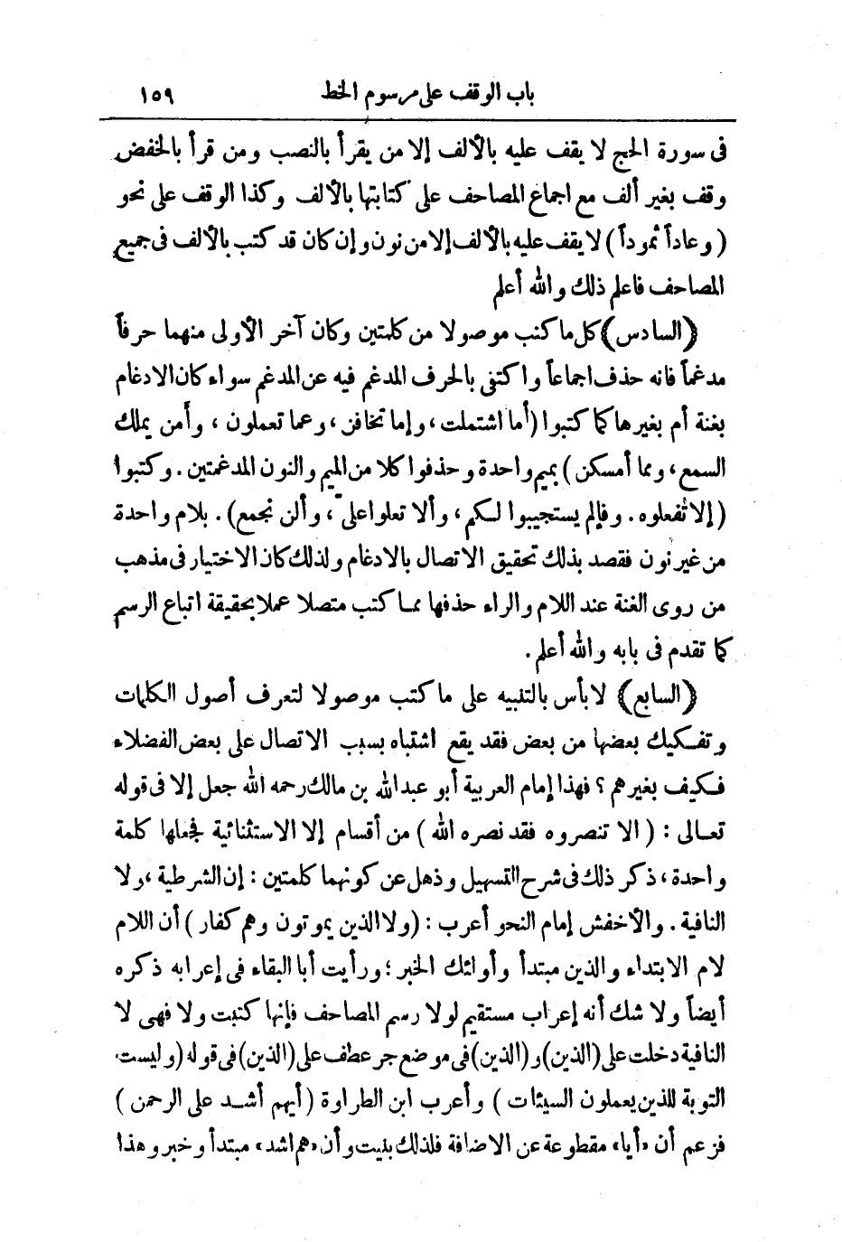 (السَّابِعُ) لَا بَأْسَ بِالتَّنْبِيهِ عَلَى مَا كُتِبَ مَوْصُولًا لِتُعْرَفَ أُصُولُ الْكَلِمَاتِ وَتَفْكِيكُ بَعْضِهَا مِنْ بَعْضٍ، فَقَدْ يَقَعُ اشْتِبَاهٌ بِسَبَبِ الِاتِّصَالِ عَلَى بَعْضِ الْفُضَلَاءِ فَكَيْفَ بِغَيْرِهِمْ؟ فَهَذَا إِمَامُ الْعَرَبِيَّةِ أَبُو عَبْدِ اللَّهِ بْنُ مَالِكٍ رَحِمَهُ اللَّهُ جَعَلَ إِلَّا فِي قَوْلِهِ تَعَالَى: إِلَّا تَنْصُرُوهُ فَقَدْ نَصَرَهُ اللَّهُ مِنْ أَقْسَامِ إِلَّا الِاسْتِثْنَائِيَّةِ فَجَعَلَهَا كَلِمَةً وَاحِدَةً، ذُكِرَ ذَلِكَ فِي شَرْحِ التَّسْهِيلِ وَذُهِلَ عَنْ كَوْنِهِمَا كَلِمَتَيْنِ: إِنَّ الشَّرْطِيَّةَ، وَلَا النَّافِيَةَ. وَالْأَخْفَشُ إِمَامُ النَّحْوِ أَعْرَبَ: وَلَا الَّذِينَ يَمُوتُونَ وَهُمْ كُفَّارٌ أَنَّ اللَّامَ لَامُ الِابْتِدَاءِ وَالَّذِينَ مُبْتَدَأٌ وَأُولَئِكَ الْخَبَرُ ; وَرَأَيْتُ أَبَا الْبَقَاءِ فِي إِعْرَابِهِ ذَكَرَهُ أَيْضًا، وَلَا شَكَّ أَنَّهُ إِعْرَابٌ مُسْتَقِيمٌ لَوْلَا رَسْمُ الْمَصَاحِفِ فَإِنَّهَا كُتِبَتْ، وَلَا فَهِيَ لَا النَّافِيَةُ دَخَلَتْ عَلَى (الَّذِينَ) وَ (الَّذِينَ) فِي مَوْضِعِ جَرٍّ عَطْفًا عَلَى (الَّذِينَ) فِي قَوْلِهِ (وَلَيْسَتِ التَّوْبَةُ لِلَّذِينَ يَعْمَلُونَ السَّيِّئَاتِ) وَأَعْرَبَ ابْنُ الطَّرَاوَةِ أَيُّهُمْ أَشَدُّ عَلَى الرَّحْمَنِ فَزَعَمَ أَنَّ " أَيًّا " مَقْطُوعَةٌ عَنِ الْإِضَافَةِ فَلِذَلِكَ بُنِيَتْ وَأَنَّ " هُمْ أَشَدَّ " مُبْتَدَأٌ وَخَبَرٌ، وَهَذَا