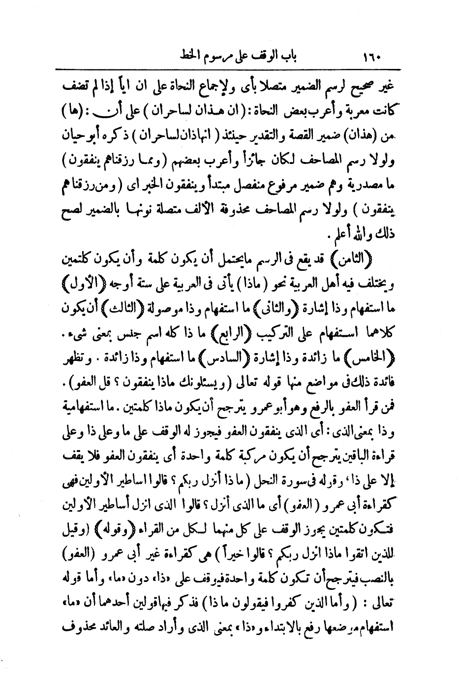 (الثَّامِنُ) قَدْ يَقَعُ فِي الرَّسْمِ مَا يُحْتَمَلُ أَنْ يَكُونَ كَلِمَةً وَاحِدَةً وَأَنْ يَكُونَ كَلِمَتَيْنِ وَيَخْتَلِفُ فِيهِ أَهْلُ الْعَرَبِيَّةِ نَحْوَ (مَاذَا) يَأْتِي فِي الْعَرَبِيَّةِ عَلَى سِتَّةِ، أَوْجُهٍ.