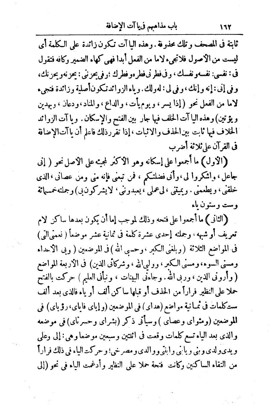 (الْأَوَّلُ) : مَا أَجْمَعُوا عَلَى إِسْكَانِهِ، وَهُوَ الْأَكْثَرُ لِمَجِيئِهِ عَلَى الْأَصْلِ نَحْوَ (إِنِّي جَاعِلٌ، وَاشْكُرُوا لِي، وَأَنِّي فَضَّلْتُكُمْ، فَمَنْ تَبِعَنِي فَإِنَّهُ مِنِّي وَمَنْ عَصَانِي، الَّذِي خَلَقَنِي، وَيُطْعِمُنِي، وَيُمِيتُنِي، لِي عَمَلِي، يَعْبُدُونِي لَا يُشْرِكُونَ بِي) وَجُمْلَتُهُ خَمْسُمِائَةٌ وَسِتٌّ وَسِتُّونَ يَاءً.