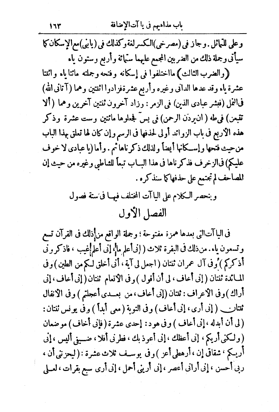 وَيَنْحَصِرُ الْكَلَامُ عَلَى الْيَاءَاتِ الْمُخْتَلَفِ فِيهَا فِي سِتِّ فُصُولٍ