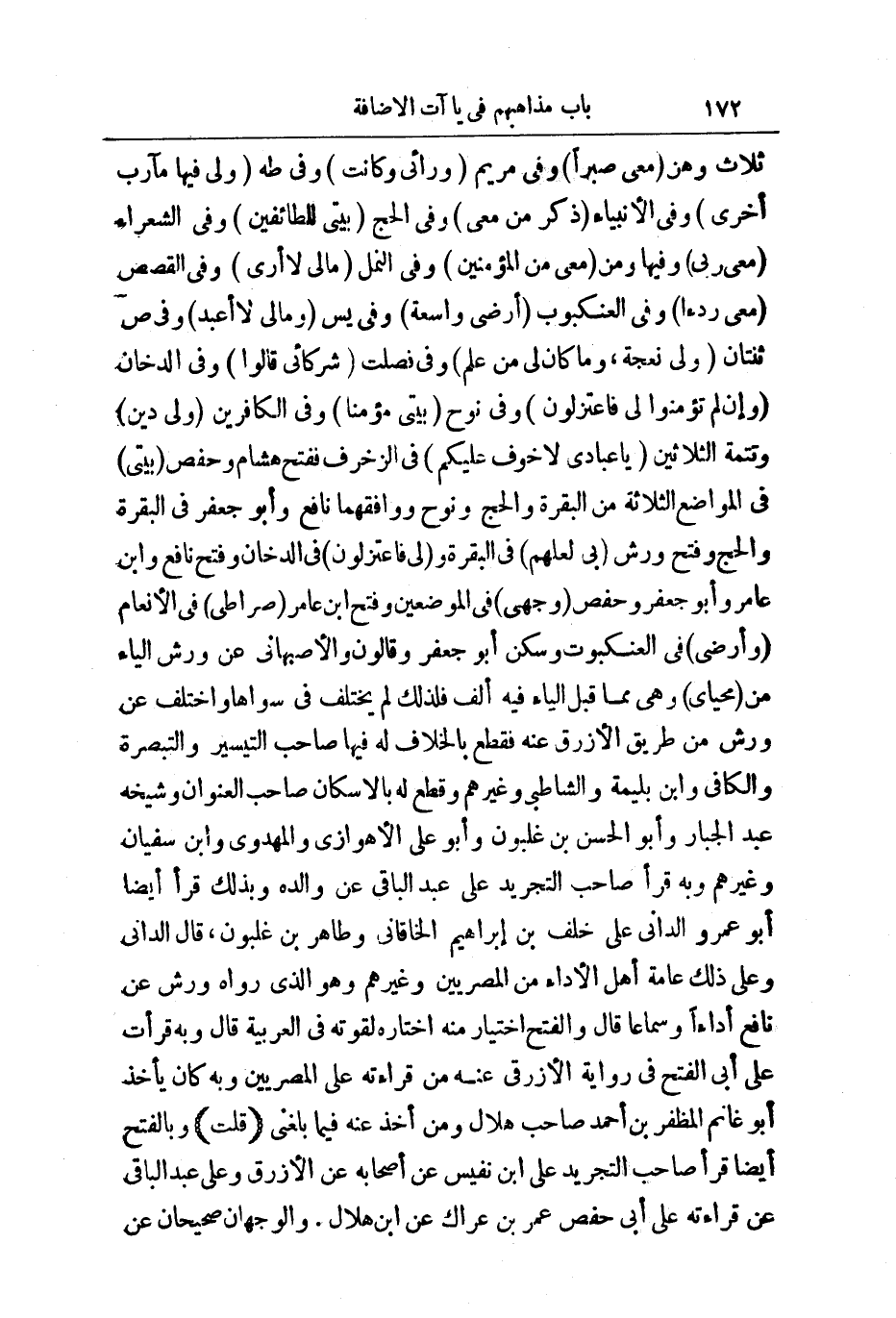 ثَلَاثٌ وَهُنَّ مَعِيَ صَبْرًا، وَفِي مَرْيَمَ وَرَائِي وَكَانَتِ، وَفِي طه وَلِيَ فِيهَا مَآرِبُ أُخْرَى، وَفِي الْأَنْبِيَاءِ ذِكْرُ مَنْ مَعِيَ، وَفِي الْحَجِّ بَيْتِيَ لِلطَّائِفِينَ، وَفِي الشُّعَرَاءِ مَعِيَ رَبِّي، وَفِيهَا وَمَنْ مَعِيَ مِنَ الْمُؤْمِنِينَ، وَفِي النَّمْلِ مَا لِيَ لَا أَرَى، وَفِي الْقَصَصِ مَعِيَ رِدْءًا، وَفِي الْعَنْكَبُوتِ أَرْضِي وَاسِعَةٌ، وَفِي يس وَمَا لِيَ لَا أَعْبُدُ، وَفِي ص ثِنْتَانِ وَلِيَ نَعْجَةٌ، وَمَا كَانَ لِيَ مِنْ عِلْمٍ، وَفِي فُصِّلَتْ شُرَكَائِي قَالُوا، وَفِي الدُّخَانِ وَإِنْ لَمْ تُؤْمِنُوا لِي فَاعْتَزِلُونِ، وَفِي نُوحٍ بَيْتِيَ مُؤْمِنًا، وَفِي الْكَافِرِينَ وَلِيَ دِينِ وَتَتِمَّةُ الثَّلَاثِينَ يَاعِبَادِيَ لَا خَوْفٌ عَلَيْكُمْ فِي الزُّخْرُفِ فَفَتَحَ هِشَامٌ وَحَفْصٌ بَيْتِيَ فِي الْمَوَاضِعِ الثَّلَاثَةِ مِنَ الْبَقَرَةِ وَالْحَجِّ وَنُوحٍ، وَوَافَقَهُمَا نَافِعٌ وَأَبُو جَعْفَرٍ فِي الْبَقَرَةِ وَالْحَجِّ وَفَتَحَ وَرْشٌ، بِي لَعَلَّهُمْ فِي الْبَقَرَةِ وَلِي فَاعْتَزِلُونِ فِي الدُّخَانِ.