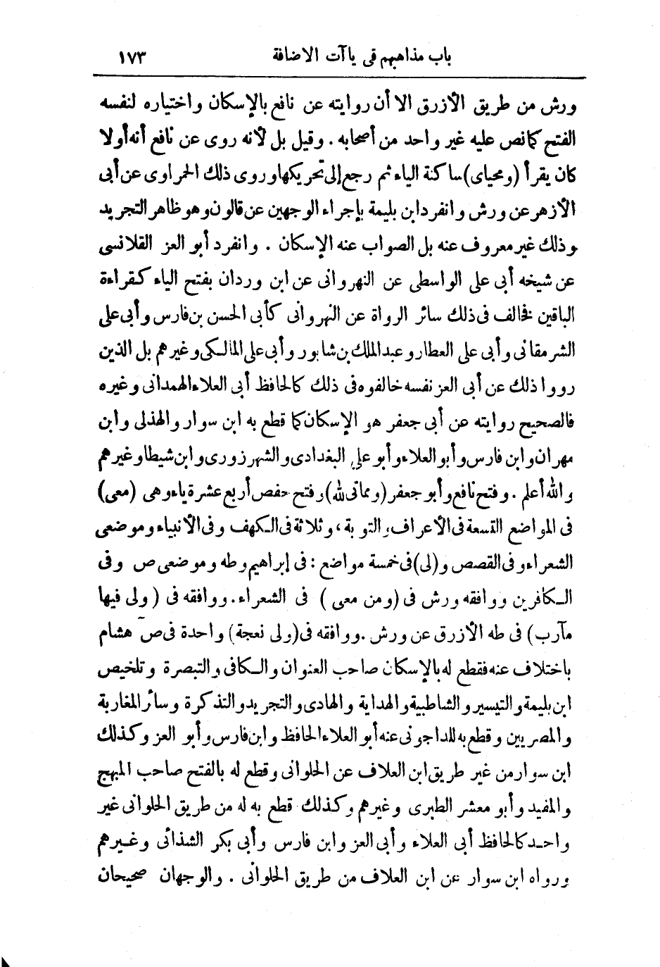 وَانْفَرَدَ ابْنُ بَلِّيمَةَ بِإِجْرَاءِ الْوَجْهَيْنِ عَنْ قَالُونَ، وَهُوَ ظَاهِرُ التَّجْرِيدِ، وَذَلِكَ غَيْرُ مَعْرُوفٍ عَنْهُ، بَلِ الصَّوَابُ عَنْهُ بِالْإِسْكَانِ. وَانْفَرَدَ أَبُو الْعِزِّ الْقَلَانِسِيُّ عَنْ شَيْخِهِ أَبِي عَلِيٍّ الْوَاسِطِيِّ عَنِ النَّهْرَوَانِيِّ عَنْ أَبِي وَرْدَانَ بِفَتْحِ الْيَاءِ كَقِرَاءَةِ الْبَاقِينَ فَخَالَفَ فِي ذَلِكَ سَائِرَ الرُّوَاةِ عَنِ النَّهْرَوَانِيِّ كَأَبِي الْحَسَنِ بْنِ فَارِسٍ وَأَبِي عَلِيٍّ الشَّرْمَقَانِيِّ وَأَبِي عَلِيٍّ الْعَطَّارِ وَعَبْدِ الْمَلِكِ بْنِ شَابُورٍ وَأَبِي عَلِيٍّ الْمَالِكِيِّ، وَغَيْرِهِمْ، بَلِ الَّذِينَ رَوَوْا ذَلِكَ عَنْ أَبِي الْعِزِّ، نَفْسِهِ خَالَفُوهُ فِي ذَلِكَ كَالْحَافِظِ أَبِي الْعَلَاءِ الْهَمْدَانِيِّ، وَغَيْرِهِ فَالصَّحِيحُ رِوَايَتُهُ عَنْ أَبِي جَعْفَرٍ هُوَ الْإِسْكَانُ كَمَا قَطَعَ بِهِ ابْنُ سَوَّارٍ وَالْهُذَلِيُّ وَابْنُ مِهْرَانَ وَابْنُ فَارِسٍ وَأَبُو الْعَلَاءِ وَأَبُو عَلِيٍّ الْبَغْدَادِيُّ وَالشَّهْرَزُورِيُّ وَابْنُ شَيْطٍ، وَغَيْرُهُمْ - وَاللَّهُ أَعْلَمُ -.