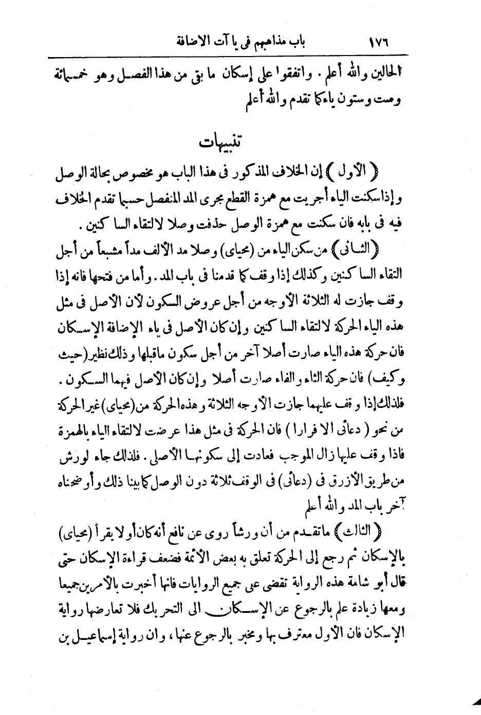 (الثَّالِثُ) : مَا تَقَدَّمَ مِنْ أَنَّ وَرْشًا رَوَى عَنْ نَافِعٍ أَنَّهُ كَانَ أَوَّلًا يَقْرَأُ مَحْيَايَ بِالْإِسْكَانِ ثُمَّ رَجَعَ إِلَى الْحَرَكَةِ تَعَلَّقَ بِهِ بَعْضُ الْأَئِمَّةِ فَضَعَّفَ قِرَاءَةَ الْإِسْكَانِ حَتَّى قَالَ أَبُو شَامَةَ هَذِهِ الرِّوَايَةُ تَقْضِي عَلَى جَمِيعِ الرِّوَايَاتِ فَإِنَّهَا أَخْبَرَتْ بِالْأَمْرَيْنِ جَمِيعًا وَمَعَهَا زِيَادَةُ عَلَمٍ بِالرُّجُوعِ عَنِ الْإِسْكَانِ إِلَى التَّحْرِيكِ فَلَا تُعَارِضُهَا رِوَايَةَ الْإِسْكَانِ فَإِنَّ الْأَوَّلَ مُعْتَرَفٌ بِهَا وَمُخْبَرٌ بِالرُّجُوعِ عَنْهَا، وَإِنَّ رِوَايَةَ إِسْمَاعِيلَ بْنِ
