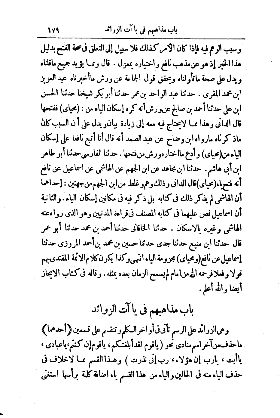 حَدَّثَنَا الْخَاقَانِيُّ حَدَّثَنَا أَحْمَدُ بْنُ مُحَمَّدٍ حَدَّثَنَا أَبُو عُمَرَ قَالَ: حَدَّثَنَا ابْنُ مَنِيعٍ حَدَّثَنَا جَدِّي حَدَّثَنَا حُسَيْنُ بْنُ مُحَمَّدِ بْنِ أَحْمَدَ الْمَرْوَزِيُّ حَدَّثَنَا إِسْمَاعِيلُ عَنْ نَافِعٍ وَمَحْيَايَ مَجْزُومَةَ الْيَاءِ انْتَهَى، وَكَذَا يَكُونُ كَلَامُ الْأَئِمَّةِ الْمُقْتَدَى بِهِمْ قَوْلًا وَفِعْلًا فَرَحِمَهُ اللَّهُ مِنْ إِمَامٍ لَمْ يَسْمَحِ الزَّمَانُ بَعْدَهُ بِمِثْلِهِ. وَقَالَهُ فِي كِتَابِ الْإِيجَازِ أَيْضًا - وَاللَّهُ أَعْلَمُ -.