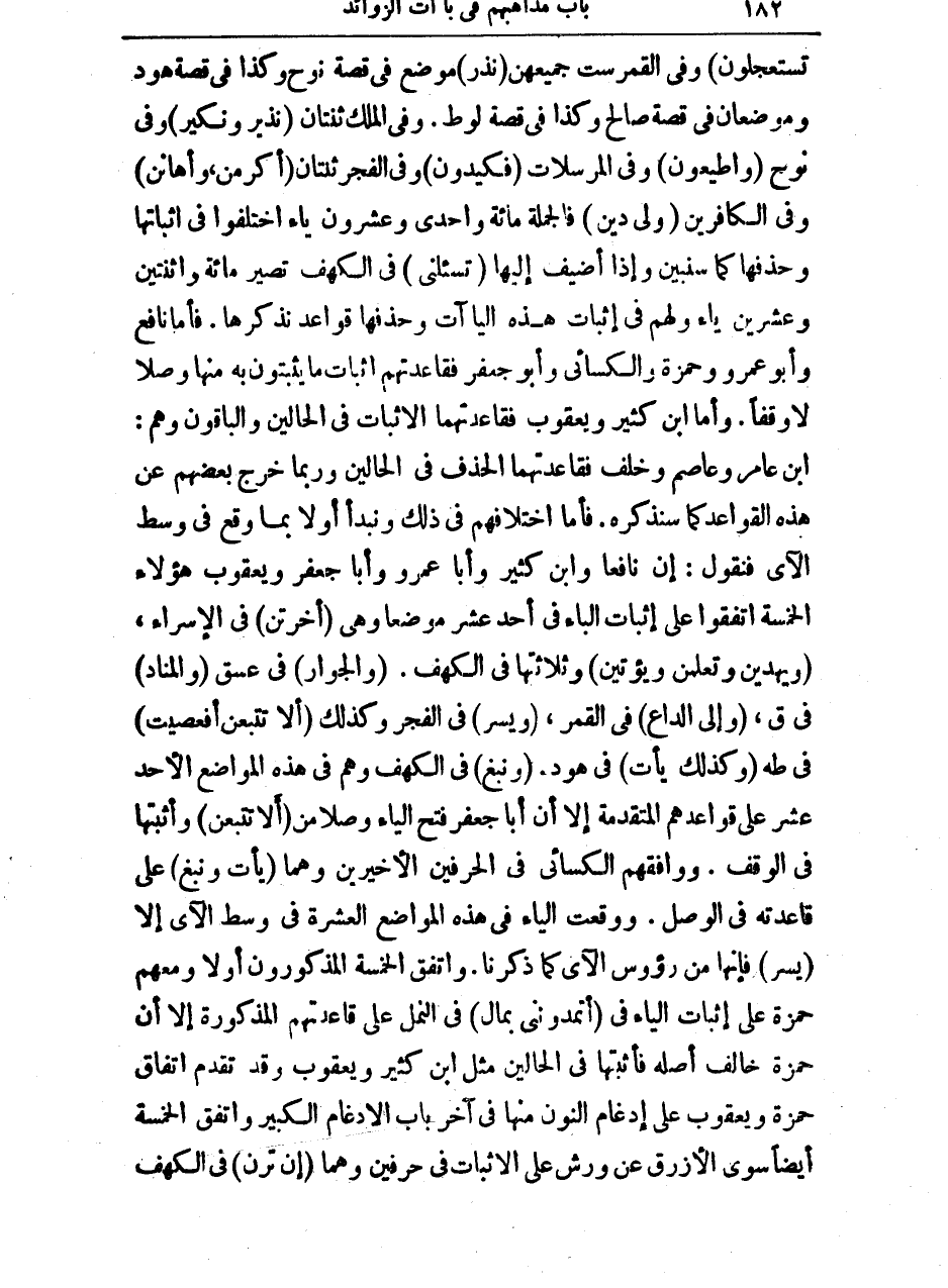 تَسْتَعْجِلُونَ، وَفِي الْقَمَرِ سِتٌّ جَمِيعُهُنَّ نَذْرٍ مَوْضِعٌ فِي قِصَّةِ نُوحٍ، وَكَذَا فِي قِصَّةِ هُودٍ وَمَوْضِعَانِ فِي قِصَّةِ صَالِحٍ، وَكَذَا فِي قِصَّةِ لُوطٍ. وَفِي الْمُلْكِ ثِنْتَانِ نَذِيرٌ وَنَكِيرِ، وَفِي نُوحٍ وَأَطِيعُونِ، وَفِي الْمُرْسَلَاتِ فَكِيدُونِ، وَفِي الْفَجْرِ ثِنْتَانِ أَكْرَمَنِ، وَأَهَانَنِ، وَفِي الْكَافِرِينَ وَلِيَ دِينِ فَالْجُمْلَةُ مِائَةٌ وَإِحْدَى وَعِشْرُونَ يَاءً اخْتَلَفُوا فِي إِثْبَاتِهَا وَحَذْفِهَا كَمَا سَنُبَيِّنُ، وَإِذَا أُضِيفَ إِلَيْهَا تَسْأَلْنِي فِي الْكَهْفِ تَصِيرُ مِائَةً وَاثْنَتَيْنِ وَعِشْرِينَ يَاءً وَلَهُمْ فِي إِثْبَاتِ هَذِهِ الْيَاءَاتِ وَحَذْفِهَا قَوَاعِدُ نَذْكُرُهَا.