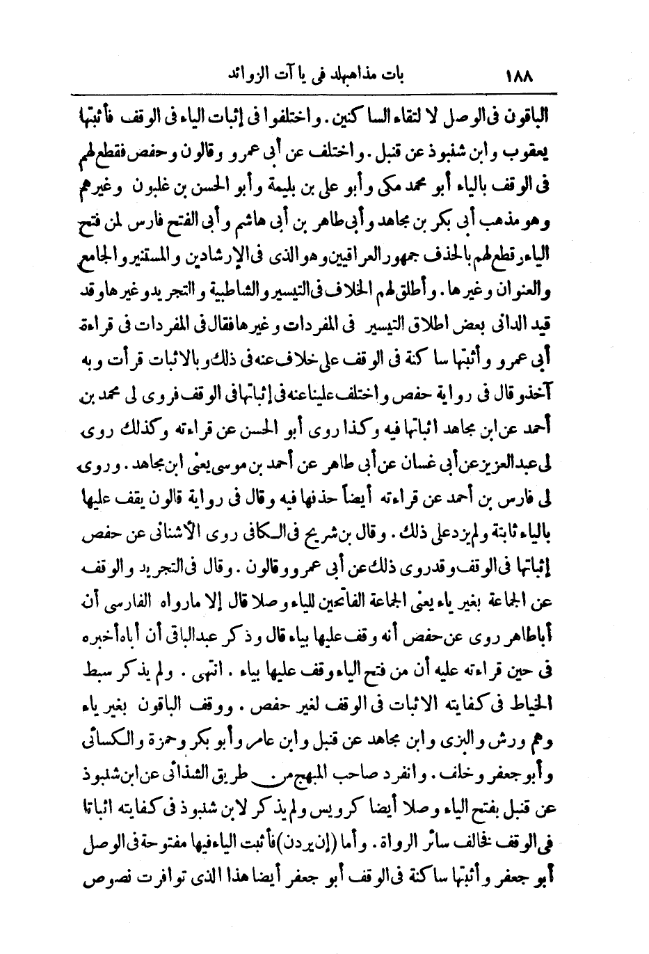 الْبَاقُونَ فِي الْوَصْلِ لِالْتِقَاءِ السَّاكِنَيْنِ. (وَاخْتَلَفُوا) فِي: إِثْبَاتِ الْيَاءِ فِي الْوَقْفِ فَأَثْبَتَهَا يَعْقُوبُ وَابْنُ شَنَبُوذَ عَنْ قُنْبُلٍ. وَاخْتُلِفَ عَنْ أَبِي عَمْرٍو وَقَالُونَ وَحَفْصٍ فَقَطَعَ فِي الْوَقْفِ بِالْيَاءِ أَبُو مُحَمَّدٍ مَكِّيٌّ وَأَبُو عَلِيِّ بْنُ بَلِّيمَةَ وَأَبُو الْحَسَنِ بْنُ غَلْبُونَ، وَغَيْرُهُمْ، وَهُوَ مَذْهَبُ أَبِي بَكْرِ بْنِ مُجَاهِدٍ وَأَبِي طَاهِرِ بْنِ أَبِي هَاشِمٍ، وَأَبِي الْفَتْحِ فَارِسٍ لِمَنْ فَتَحَ الْيَاءَ، وَقَطَعَ لَهُمْ بِالْحَذْفِ جُمْهُورُ الْعِرَاقِيِّينَ، وَهُوَ الَّذِي فِي الْإِرْشَادَيْنِ، وَالْمُسْتَنِيرِ، وَالْجَامِعِ، وَالْعُنْوَانِ، وَغَيْرِهَا. وَأَطْلَقَ لَهُمُ الْخِلَافَ فِي التَّيْسِيرِ، وَالشَّاطِبِيَّةِ، وَالتَّجْرِيدِ، وَغَيْرِهَا.