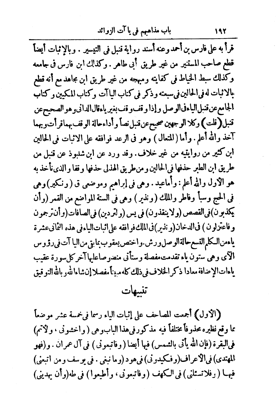(الْأَوَّلُ) : أَجْمَعَتِ الْمَصَاحِفُ عَلَى إِثْبَاتِ الْيَاءِ رَسْمًا فِي خَمْسَةَ عَشَرَ مَوْضِعًا مِمَّا وَقَعَ نَظِيرُهُ مَحْذُوفًا مُخْتَلَفًا فِيهِ مَذْكُورٌ فِي هَذَا الْبَابِ، وَهِيَ (وَاخْشَوْنِي، وَلِأُتِمَّ) فِي الْبَقَرَةِ فَإِنَّ اللَّهَ يَأْتِي بِالشَّمْسِ فِيهَا أَيْضًا (وَفَاتَّبِعُونِي) فِي آلِ عِمْرَانَ. وَفَهُوَ الْمُهْتَدِي فِي الْأَعْرَافِ (وَفَكِيدُونِي) فِي هُودٍ (وَمَا نَبْغِي) فِي يُوسُفَ، وَمَنِ اتَّبَعَنِي فِيهَا (وَفَلَا تَسْأَلْنِي) فِي الْكَهْفِ (وَفَاتَّبِعُونِي، وَأَطِيعُونِ) فِي طه وَأَنْ يُحْشَرَ.
