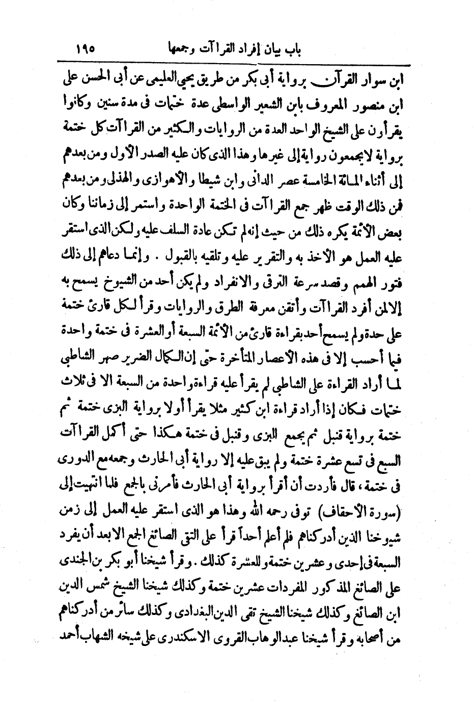 ابْنِ سَوَّارٍ الْقُرْآنَ بِرِوَايَةِ أَبِي بَكْرٍ مِنْ طَرِيقِ يَحْيَى الْعُلَيْمِيِّ عَنْ أَبِي الْحَسَنِ عَلَى ابْنِ مَنْصُورٍ الْمَعْرُوفِ بِابْنِ الشَّعِيرِ الْوَاسِطِيِّ عِدَّةَ خَتَمَاتٍ فِي مُدَّةِ سِنِينَ وَكَانُوا يَقْرَءُونَ عَلَى الشَّيْخِ الْوَاحِدِ الْعِدَّةَ مِنَ الرِّوَايَاتِ وَالْكَثِيرَ مِنَ الْقِرَاءَاتِ كُلُّ خَتْمَةٍ بِرِوَايَةٍ لَا يَجْمَعُونَ رِوَايَةً إِلَى غَيْرِهَا، وَهَذَا الَّذِي كَانَ عَلَيْهِ الصَّدْرُ الْأَوَّلُ، وَمَنْ بَعْدَهُمْ إِلَى أَثْنَاءِ الْمِائَةِ الْخَامِسَةِ عَصْرِ الدَّانِيِّ وَابْنِ شَيْطَا الْأَهْوَازِيِّ وَالْهُذَلِيِّ، وَمَنْ بَعْدَهُمْ فَمِنْ ذَلِكَ الْوَقْتِ ظَهَرَ جَمْعُ الْقِرَاءَاتِ فِي الْخَتْمَةِ الْوَاحِدَةِ وَاسْتَمَرَّ إِلَى زَمَانِنَا وَكَانَ بَعْضُ الْأَئِمَّةِ يَكْرَهُ ذَلِكَ مِنْ حَيْثُ إِنَّهُ لَمْ تَكُنْ عَادَةُ السَّلَفِ عَلَيْهِ وَلَكِنَّ الَّذِي اسْتَقَرَّ عَلَيْهِ الْعَمَلُ هُوَ الْأَخْذُ بِهِ وَالتَّقْرِيرُ عَلَيْهِ وَتَلَقِّيهِ بِالْقَبُولِ.