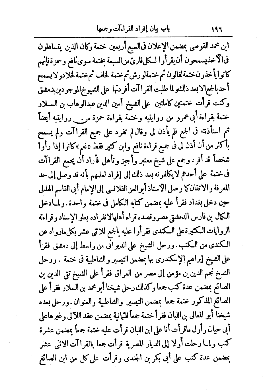 بْنِ مُحَمَّدٍ الْقُوصِيِّ بِمُضْمَنِ الْإِعْلَانِ فِي السَّبْعِ أَرْبَعِينَ خَتْمَةً وَكَانَ الَّذِينَ يَتَسَاهَلُونَ فِي الْأَخْذِ يَسْمَحُونَ أَنْ يَقْرَءُوا لِكُلِّ قَارِئٍ مِنَ السَّبْعَةِ بِخَتْمَةٍ سِوَى نَافِعٍ وَحَمْزَةَ فَإِنَّهُمْ كَانُوا يَأْخُذُونَ خَتْمَةً لَقَالُونَ ثُمَّ خَتْمَةً لِوَرْشٍ، ثُمَّ خَتْمَةً لِخَلَفٍ ثُمَّ خَتْمَةً لِخَلَّادٍ، وَلَا يَسْمَحُ أَحَدٌ بِالْجَمْعِ إِلَّا بَعْدَ ذَلِكَ، وَلِمَا طَلَبْتُ الْقِرَاءَاتِ أَفْرَدْتُهَا عَلَى الشُّيُوخِ الْمَوْجُودِينَ بِدِمَشْقَ وَكُنْتُ قَرَأْتُ خَتْمَتَيْنِ كَامِلَتَيْنِ عَلَى الشَّيْخِ أَمِينِ الدِّينِ عَبْدِ الْوَهَّابِ بْنِ السِلَارِ خَتْمَةً بِقِرَاءَةِ أَبِي عَمْرٍو مِنْ رِوَايَتَيْهِ وَخَتْمَةً بِقِرَاءَةِ حَمْزَةَ مِنْ رِوَايَتَيْهِ أَيْضًا ثُمَّ اسْتَأْذَنْتُهُ فِي الْجَمْعِ فَلَمْ يَأْذَنْ لِي، وَقَالَ: لَمْ تُفْرِدْ عَلَى جَمْعِ الْقِرَاءَاتِ، وَلَمْ يَسْمَحْ بِأَكْثَرَ مِنْ أَنْ أَذِنَ لِي فِي جَمْعِ قِرَاءَةِ نَافِعٍ وَابْنِ كَثِيرٍ فَقَطْ " نَعَمْ " كَانُوا إِذَا رَأَوْا شَخْصًا قَدْ أَفْرَدَ وَجَمَعَ عَلَى شَيْخٍ مُعْتَبَرٍ وَأُجِيزَ وَتَأَهَّلَ فَأَرَادَ أَنْ يَجْمَعَ الْقِرَاءَاتِ فِي خَتْمَةٍ عَلَى أَحَدِهِمْ لَا يُكَلِّفُونَهُ بَعْدَ ذَلِكَ إِلَى إِفْرَادٍ لِعِلْمِهِمْ بِأَنَّهُ قَدْ وَصَلَ إِلَى حَدِ الْمَعْرِفَةِ وَالْإِتْقَانِ كَمَا وَصَلَ الْأُسْتَاذُ أَبُو الْعِزِّ الْقَلَانِسِيُّ إِلَى الْإِمَامِ أَبِي الْقَاسِمِ الْهُذَلِيِّ حِينَ دَخَلَ بَغْدَادَ فَقَرَأَ عَلَيْهِ بِمُضْمَنِ كِتَابِهِ الْكَامِلِ فِي خَتْمَةٍ وَاحِدَةٍ.