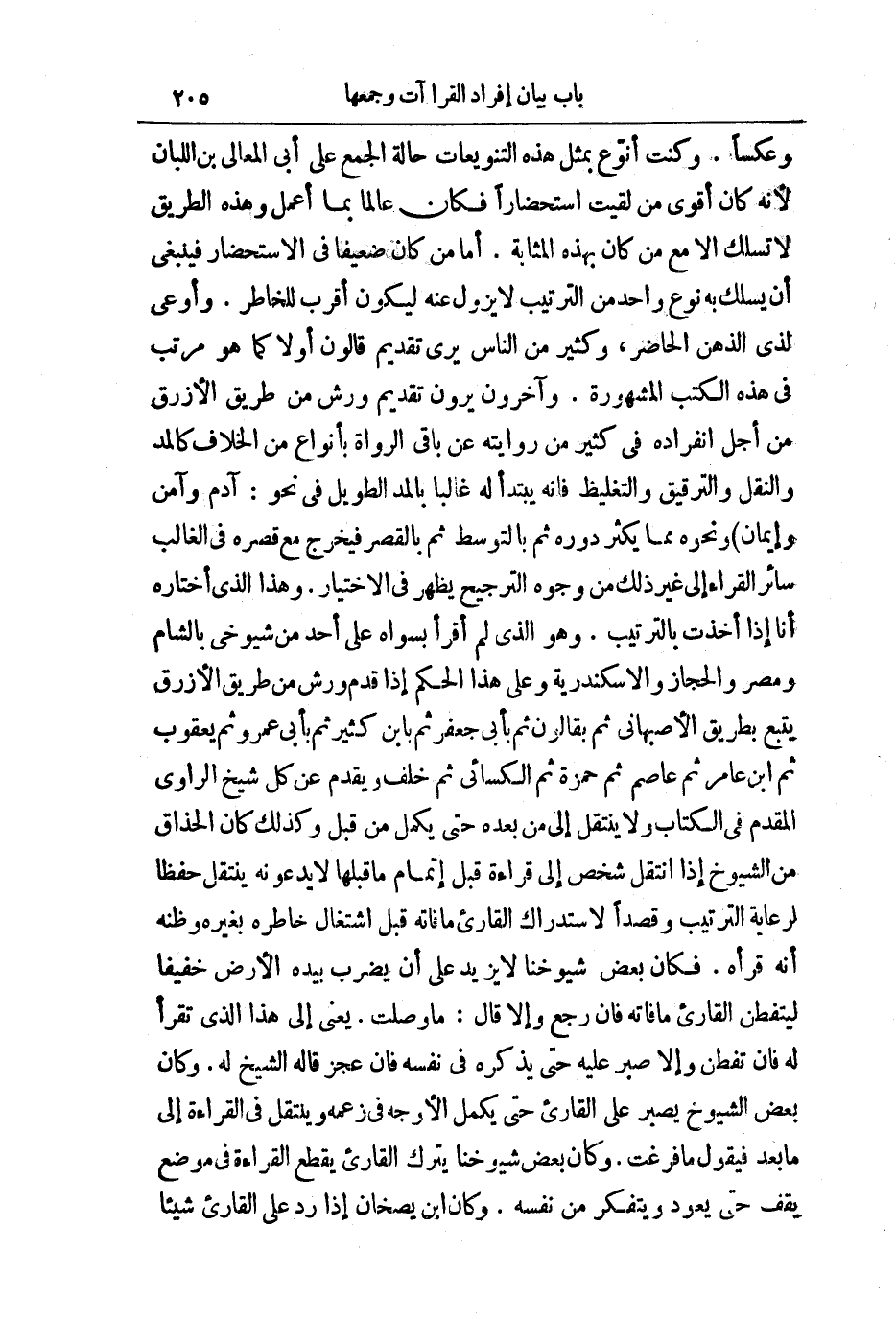 أَمَّا مَنْ كَانَ ضَعِيفًا فِي الِاسْتِحْضَارِ فَيَنْبَغِي أَنْ يَسْلُكَ بِهِ نَوْعًا وَاحِدًا مِنَ التَّرْتِيبِ لَا يَزُولُ عَنْهُ لِيَكُونَ أَقْرَبَ لِلْخَاطِرِ. وَأَوْعَى إِلَى الذِّهْنِ الْحَاضِرِ، وَكَثِيرٌ مِنَ النَّاسِ يَرَى تَقْدِيمَ قَالُونَ، أَوَّلًا كَمَا هُوَ مُرَتَّبٌ فِي هَذِهِ الْكُتُبِ الْمَشْهُورَةِ. وَآخَرُونَ يَرَوْنَ تَقْدِيمَ وَرْشٍ مِنْ طَرِيقِ الْأَزْرَقِ مِنْ أَجْلِ انْفِرَادِهِ فِي كَثِيرٍ مِنْ رِوَايَاتِهِ عَنْ بَاقِي الرُّوَاةِ بِأَنْوَاعٍ مِنَ الْخِلَافِ كَالْمَدِّ وَالنَّقْلِ وَالتَّرْقِيقِ وَالتَّغْلِيظِ فَإِنَّهُ يُبْتَدَأُ لَهُ غَالِبًا بِالْمَدِّ الطَّوِيلِ فِي نَحْوِ: آدَمَ وَآمَنَ وَإِيمَانٍ وَنَحْوَهُ مِمَّا يَكْثُرُ دَوْرُهُ، ثُمَّ بِالتَّوَسُّطِ، ثُمَّ بِالْقَصْرِ فَيَخْرُجُ مَعَ قَصْرِهِ فِي الْغَالِبِ سَائِرُ الْقُرَّاءِ إِلَى غَيْرِ ذَلِكَ مِنْ وُجُوهِ التَّرْجِيحِ يَظْهَرُ فِي الِاخْتِيَارِ. وَهَذَا الَّذِي أَخْتَارُهُ، أَمَّا إِذَا أَخَذْتَ بِالتَّرْتِيبِ، وَهُوَ الَّذِي لَمْ أَقْرَأْ بِسِوَاهُ عَلَى أَحَدٍ مِنْ شُيُوخِي بِالشَّامِ وَمِصْرَ وَالْحِجَازِ وَالْإِسْكَنْدَرِيَّةِ، وَعَلَى هَذَا الْحُكْمِ إِذَا قُدِّمَ وَرْشٌ مِنْ طَرِيقِ الْأَزْرَقِ يُتْبَعُ بِطَرِيقِ الْأَصْبَهَانِيِّ، ثُمَّ بَقَالُونَ، ثُمَّ بِأَبِي جَعْفَرٍ، ثُمَّ بِابْنِ كَثِيرٍ، ثُمَّ بِأَبِي عَمْرٍو، ثُمَّ يَعْقُوبَ ثُمَّ ابْنِ عَامِرٍ، ثُمَّ عَاصِمٍ، ثُمَّ حَمْزَةَ، ثُمَّ الْكِسَائِيِّ، ثُمَّ خَلَفٍ، وَيُقَدِّمُ عَنْ كُلِّ شَيْخٍ الرَّاوِي الْمُقَدَّمُ فِي الْكِتَابِ، وَلَا يَنْتَقِلُ إِلَى مَنْ بَعْدَهُ حَتَّى يُكْمِلَ مَنْ قَبْلُ، وَكَذَلِكَ كَانَ الْحُذَّاقُ مِنَ الشُّيُوخِ إِذَا انْتَقَلَ شَخْصٌ إِلَى قِرَاءَةٍ قَبْلَ إِتْمَامِ مَا قَبْلَهَا لَا يَدَعُونَهُ يَنْتَقِلُ حِفْظًا لِرِعَايَةِ التَّرْتِيبِ وَقَصْدًا لِاسْتِدْرَاكِ الْقَارِئِ مَا فَاتَهُ قَبْلَ اشْتِغَالِ خَاطِرِهِ بِغَيْرِهِ وَظَنِّهِ أَنَّهُ قَرَأَهُ. فَكَانَ بَعْضُ شُيُوخِنَا لَا يَزِيدُ عَلَى أَنْ يَضْرِبَ بِيَدِهِ الْأَرْضَ خَفِيفًا لِيَتَفَطَّنَ الْقَارِئُ مَا فَاتَهُ فَإِنْ رَجَعَ وَإِلَّا قَالَ: مَا وَصَلْتَ. يَعْنِي إِلَى هَذَا الَّذِي تَقْرَأُ لَهُ فَإِنْ تَفَطَّنَ وَإِلَّا صَبَرَ عَلَيْهِ حَتَّى يَذْكُرَهُ فِي نَفْسِهِ فَإِنْ عَجَزَ قَالَ الشَّيْخُ لَهُ. وَكَانَ بَعْضُ الشُّيُوخِ يَصْبِرُ عَلَى الْقَارِئِ حَتَّى يُكْمِلَ الْأَوْجُهَ فِي زَعْمِهِ وَيَنْتَقِلَ فِي الْقِرَاءَةِ إِلَى مَا بَعْدُ فَيَقُولُ مَا فَرَغْتَ. وَكَانَ بَعْضُ شُيُوخِنَا يَتْرُكُ الْقَارِئَ يَقْطَعُ الْقِرَاءَةَ فِي مَوْضِعٍ يَقِفُ حَتَّى يَعُودَ وَيَتَفَكَّرَ مِنْ نَفْسِهِ وَكَانَ ابْنُ يَصْخَانَ إِذَا رَدَّ عَلَى الْقَارِئِ شَيْئًا