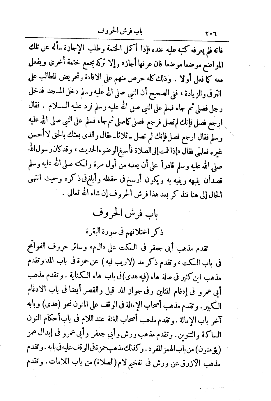 فَاتَهُ فَلَمْ يُعَرِّفْهُ كُتُبَهُ عَلَيْهِ عِنْدَهُ فَإِذَا أَكْمَلَ الْخَتْمَةَ وَطَلَبَ الْإِجَازَةَ سَأَلَهُ عَنْ تِلْكَ الْمَوَاضِعِ مَوْضِعًا مَوْضِعًا فَإِنْ عَرَفَهَا أَجَازَهُ وَإِلَّا تَرَكَهُ يَجْمَعُ خَتْمَةً أُخْرَى وَيَفْعَلُ مَعَهُ كَمَا فَعَلَ أَوَّلًا. وَذَلِكَ كُلُّهُ حِرْصٌ مِنْهُمْ عَلَى الْإِفَادَةِ وَتَحْرِيضٌ لِلطَّالِبِ عَلَى التَّرَقِّي وَالزِّيَادَةِ، فَفِي الصَّحِيحِ أَنَّ النَّبِيَّ - صَلَّى اللَّهُ عَلَيْهِ وَسَلَّمَ - دَخَلَ الْمَسْجِدَ فَدَخَلَ رَجُلٌ فَصَلَّى، ثُمَّ جَاءَ فَسَلَّمَ عَلَى النَّبِيِّ - صَلَّى اللَّهُ عَلَيْهِ وَسَلَّمَ - فَرَدَّ عَلَيْهِ السَّلَامَ. فَقَالَ: ارْجِعْ فَصَلِّ فَإِنَّكَ لَمْ تُصَلِّ فَرَجَعَ فَصَلَّى كَمَا صَلَّى، ثُمَّ جَاءَ فَسَلَّمَ عَلَى النَّبِيِّ - صَلَّى اللَّهُ عَلَيْهِ وَسَلَّمَ - فَقَالَ: ارْجِعْ فَصَلِّ فَإِنَّكَ لَمْ تُصَلِّ - ثَلَاثًا - فَقَالَ: وَالَّذِي بَعَثَكَ بِالْحَقِّ لَا أُحْسِنُ غَيْرَهُ فَعَلِّمْنِي فَقَالَ: " إِذَا قُمْتَ إِلَى الصَّلَاةِ فَأَسْبِغِ الْوُضُوءَ. . . . . الْحَدِيثَ "، وَقَدْ كَانَ رَسُولُ اللَّهِ - صَلَّى اللَّهُ عَلَيْهِ وَسَلَّمَ - قَادِرًا عَلَى أَنْ يُعَلِّمَهُ مِنْ أَوَّلِ مَرَّةٍ، وَلَكِنَّهُ - صَلَّى اللَّهُ عَلَيْهِ وَسَلَّمَ - قَصَدَ أَنْ يُنَبِّهَهُ وَيُنَبِّهَ بِهِ وَيَكُونَ أَرْسَخَ فِي حِفْظِهِ وَأَبْلَغَ فِي ذِكْرِهِ وَحَيْثُ انْتَهَى الْحَالُ إِلَى هُنَا فَنَذْكُرُ بَعْدَ هَذَا فَرْشَ الْحُرُوفِ - إِنْ شَاءَ اللَّهُ تَعَالَى -.