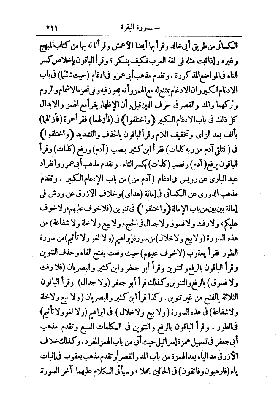(وَاخْتَلَفُوا) فِي: فَتَلَقَّى آدَمُ مِنْ رَبِّهِ كَلِمَاتٍ فَقَرَأَ ابْنُ كَثِيرٍ بِنَصْبِ آدَمَ وَرَفْعِ كَلِمَاتٍ، وَقَرَأَ الْبَاقُونَ بِرَفْعِ آدَمَ، وَنَصْبِ كَلِمَاتٍ بِكَسْرِ التَّاءِ، وَتَقَدَّمَ مَذْهَبُ أَبِي عَمْرٍو وَانْفِرَادُ عَبْدِ الْبَارِّي عَنْ رُوَيْسٍ فِي إِدْغَامِ آدَمُ مِنْ مِنْ بَابِ الْإِدْغَامِ الْكَبِيرِ. وَتَقَدَّمَ مَذْهَبُ الدُّورِيِّ عَنِ الْكِسَائِيِّ فِي إِمَالَةِ هُدَايَ وَخِلَافُ الْأَزْرَقِ عَنْ وَرْشٍ فِي إِمَالَةِ بَيْنَ بَيْنَ مِنْ بَابِ الْإِمَالَةِ