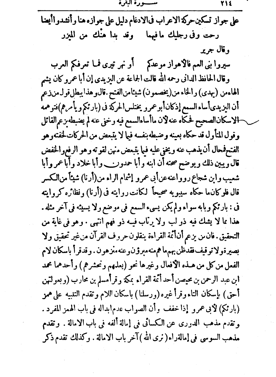 وَقَالَ الْحَافِظُ الدَّانِيُّ: رَحِمَهُ اللَّهُ قَالَتِ الْجَمَاعَةُ عَنِ الْيَزِيدِيِّ إِنَّ أَبَا عَمْرٍو وَكَانَ يُشِمُّ الْهَاءَ مِنْ يَهْدِي وَالْخَاءَ مِنْ يَخِصِّمُونَ شَيْئًا مِنَ الْفَتْحِ. قَالَ: وَهَذَا يُبْطِلُ قَوْلَ مَنْ زَعَمَ أَنَّ الْيَزِيدِيَّ أَسَاءَ السَّمْعَ إِذْ كَانَ أَبُو عَمْرٍو يَخْتَلِسُ الْحَرَكَةَ فِي بَارِئِكُمْ وَيَأْمُرُهُمْ فَتَوَهَّمَهُ الْإِسْكَانَ الصَّحِيحَ فَحَكَاهُ عَنْهُ لِأَنَّ مَا سَاءَ السَّمْعَ فِيهِ وَخَفِيَ عَنْهُ لَمْ يَضْبِطْهُ بِزَعْمِ الْقَائِلِ وَقَوْلِ الْمُتَأَوِّلِ، وَقَدْ حَكَاهُ بِعَيْنِهِ وَضَبَطَهُ بِنَفْسِهِ فِيمَا لَا يَتَبَعَّضُ مِنَ الْحَرَكَاتِ لِخِفَّتِهِ، وَهُوَ الْفَتْحُ فَمُحَالٌ أَنْ يَذْهَبَ عَنْهُ وَيَخْفَى عَلَيْهِ فِيمَا يَتَبَعَّضُ مِنْهُنَّ لِقُوَّتِهِ، وَهُوَ الرَّفْعُ وَالْخَفْضُ قَالَ: وَيُبَيِّنُ ذَلِكَ وَيُوَضِّحُ صِحَّتَهُ أَنَّ ابْنَهُ، وَأَبَا حَمْدُونَ وَأَبَا خَلَّادٍ وَأَبَا عُمَرَ وَأَبَا شُعَيْبٍ وَابْنَ شُجَاعٍ رَوَوْا عَنْهُ عَنْ أَبِي عَمْرٍو إِشْمَامَ الرَّاءِ مِنْ (أَرِنَا) شَيْئًا مِنَ الْكَسْرِ قَالَ: فَلَوْ كَانَ مَا حَكَاهُ سِيبَوَيْهِ صَحِيحًا لَكَانَتْ رِوَايَتُهُ فِي (أَرِنَا) وَنَظَائِرِهِ كَرِوَايَتِهِ فِي: (بَارِئِكُمْ) وَبَابِهِ سَوَاءٌ، وَلَمْ يَكُنْ يُسِيءُ السَّمْعَ فِي مَوْضِعٍ، وَلَا يُسِيئُهُ فِي آخَرَ مِثْلِهِ هَذَا مِمَّا لَا يَشُكُّ فِيهِ ذُو لُبٍّ، وَلَا يَرْتَابُ فِيهِ ذُو فَهْمٍ انْتَهَى. وَهُوَ فِي غَايَةٍ مِنَ التَّحْقِيقِ. فَإِنَّ مَنْ يَزْعُمُ أَنَّ أَئِمَّةَ الْقِرَاءَةِ يَنْقُلُونَ حُرُوفَ الْقُرْآنِ مِنْ غَيْرِ تَحْقِيقٍ، وَلَا بَصِيرَةٍ، وَلَا تَوْقِيفٍ، فَقَدْ كَانَ ظَنَّ بِهِمْ مَا هُمْ مِنْهُ مُبَرَّءُونَ، وَعَنْهُ مُنَزَّهُونَ. وَقَدْ قَرَأَ بِإِسْكَانِ لَامِ الْفِعْلِ مِنْ كُلٍّ مِنْ هَذِهِ الْأَفْعَالِ، وَغَيْرِهَا. نَحْوَ يَعْلَمُهُمْ وَنَحْشُرُهُمْ وَأَحَدُهُمَا مُحَمَّدُ بْنُ عَبْدِ الرَّحْمَنِ بْنِ مُحَيْصِنٍ أَحَدُ أَئِمَّةِ الْقُرَّاءِ بِمَكَّةَ، وَقَرَأَ مُسْلِمُ بْنُ مُحَارِبٍ وَبُعُولَتُهُنَّ أَحَقُّ بِإِسْكَانِ التَّاءِ، وَقَرَأَ غَيْرُهُ وَرُسُلُنَا بِإِسْكَانِ اللَّامِ.