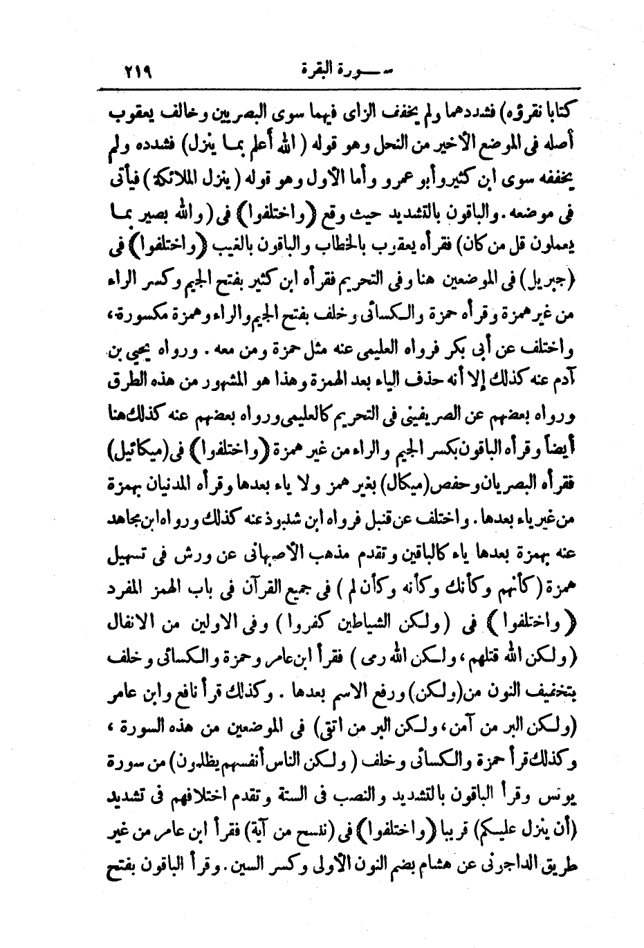 (وَاخْتَلَفُوا) فِي: وَلَكِنَّ الشَّيَاطِينَ كَفَرُوا، وَفِي الْأَوَّلِينَ مِنَ الْأَنْفَالِ وَلَكِنَّ اللَّهَ قَتَلَهُمْ، وَلَكِنَّ اللَّهَ رَمَى فَقَرَأَ ابْنُ عَامِرٍ وَحَمْزَةُ وَالْكِسَائِيُّ وَخَلَفٌ بِتَخْفِيفِ النُّونِ مِنْ وَلَكِنْ وَرَفْعِ الِاسْمِ بَعْدَهَا. وَكَذَلِكَ قَرَأَ نَافِعٌ وَابْنُ عَامِرٍ وَلَكِنَّ الْبِرَّ مَنْ آمَنَ، وَلَكِنَّ الْبِرَّ مَنِ اتَّقَى فِي الْمَوْضِعَيْنِ مِنْ هَذِهِ السُّورَةِ، وَكَذَلِكَ قَرَأَ حَمْزَةُ وَالْكِسَائِيُّ، وَخَلَفٌ وَلَكِنَّ النَّاسَ أَنْفُسَهُمْ يَظْلِمُونَ مِنْ سُورَةِ يُونُسَ، وَقَرَأَ الْبَاقُونَ بِالتَّشْدِيدِ وَالنَّصْبِ فِي السِّتَّةِ.