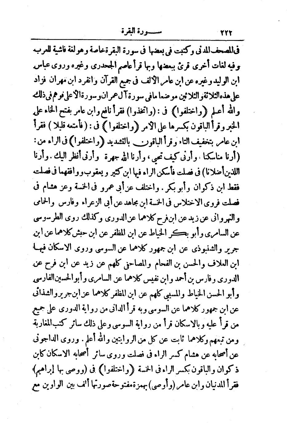 فِي الْمُصْحَفِ الْمَدَنِيِّ وَكُتِبَتْ فِي بَعْضِهَا فِي سُورَةِ الْبَقَرَةِ خَاصَّةً، وَهُوَ لُغَةٌ فَاشِيَةٌ لِلْعَرَبِ، وَفِيهِ لُغَاتٌ أُخْرَى قُرِئَ بِبَعْضِهَا، وَبِهَا قَرَأَ عَاصِمٌ الْجَحْدَرِيُّ، وَغَيْرُهُ، وَرَوَى عَبَّاسُ بْنُ الْوَلِيدِ، وَغَيْرُهُ عَنِ ابْنِ عَامِرٍ الْأَلِفَ فِي جَمِيعِ الْقُرْآنِ، وَانْفَرَدَ ابْنُ مِهْرَانَ فَزَادَ عَلَى هَذِهِ الثَّلَاثَةِ وَالثَّلَاثِينَ مَوْضِعًا مَا فِي سُورَةِ آلِ عِمْرَانَ الْأَعْلَى فَوَهِمَ فِي ذَلِكَ - وَاللَّهُ أَعْلَمُ -.