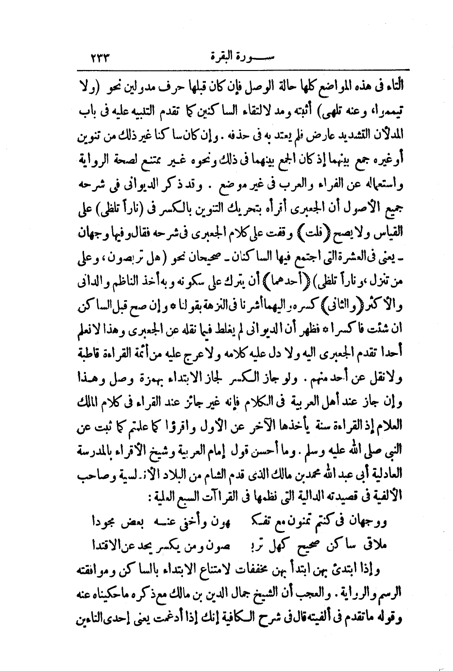 وَمَا أَحْسَنَ قَوْلَ إِمَامِ الْعَرَبِيَّةِ وَشَيْخِ الْإِقْرَاءِ بِالْمَدْرَسَةِ الْعَادِلِيَّةِ أَبِي عَبْدِ اللَّهِ مُحَمَّدِ بْنِ مَالِكٍ الَّذِي قَدِمَ الشَّامَ مِنَ الْبِلَادِ الْأَنْدَلُسِيَّةِ، وَصَاحِبِ الْأَلِفِيَّةِ فِي قَصِيدَتِهِ الدَّالِيَةِ الَّتِي نَظَمَهَا فِي الْقِرَاءَاتِ السَّبْعِ الْعَلِيَّةِ: